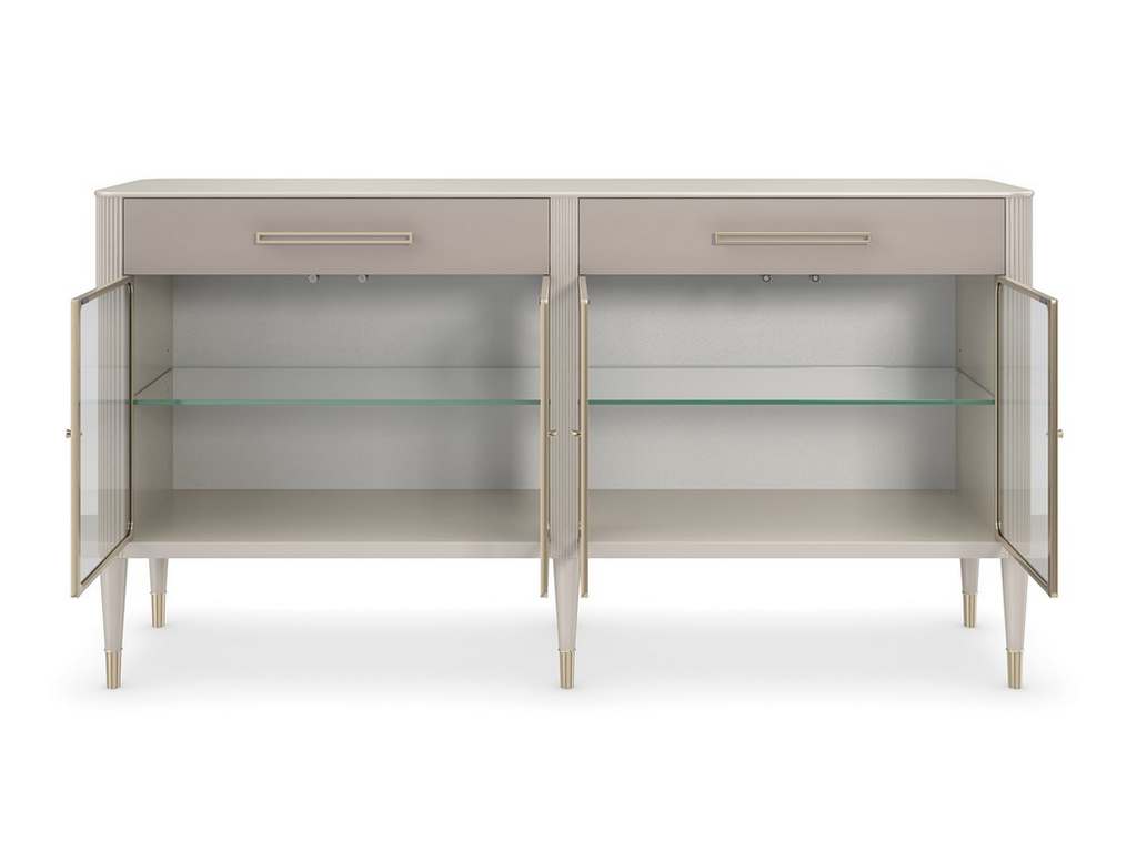 Product Description: Caracole CLA-021-681 Love Interest Buffet - This streamlined cabinet introduces a modern-yet-elegant silhouette, crafted in Birch wood with reeded details and a Matte Pearl finish. Vinyl-wrapped door fronts with linear hardware lend a contemporary element, complemented by glass doors framed in a Whisper of Gold. Its lit interior offers generous storage with adjustable glass shelves and a touch dimmer switch. Beautifully blends in with entryways, living and dining interiors.