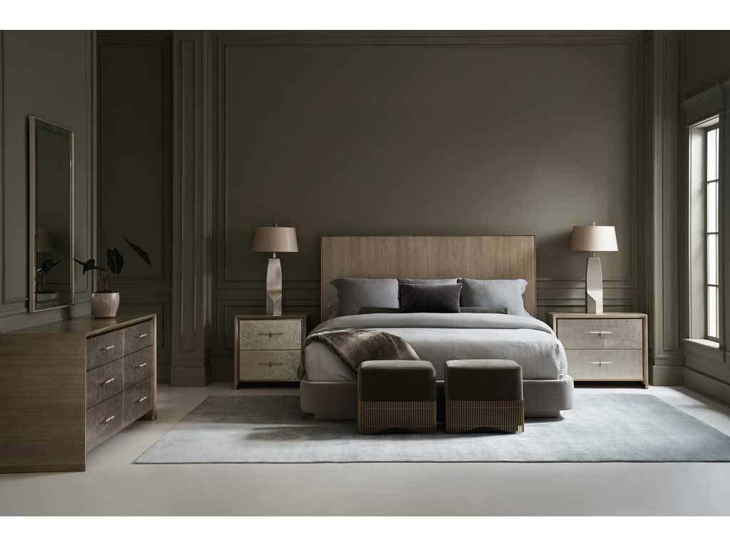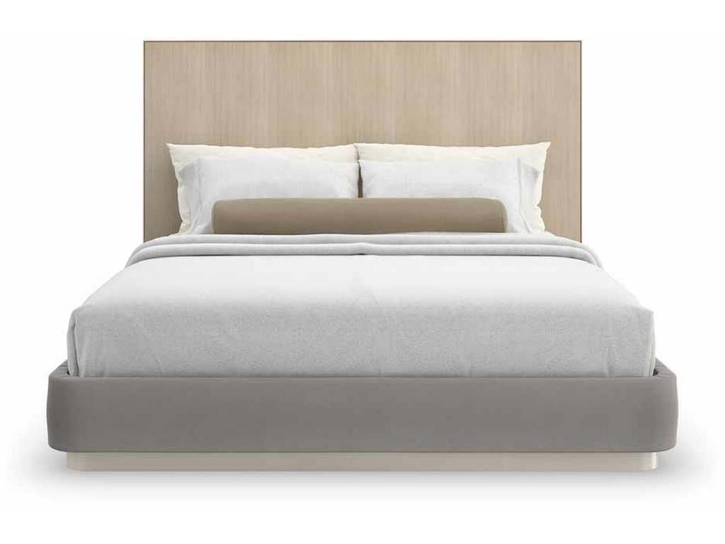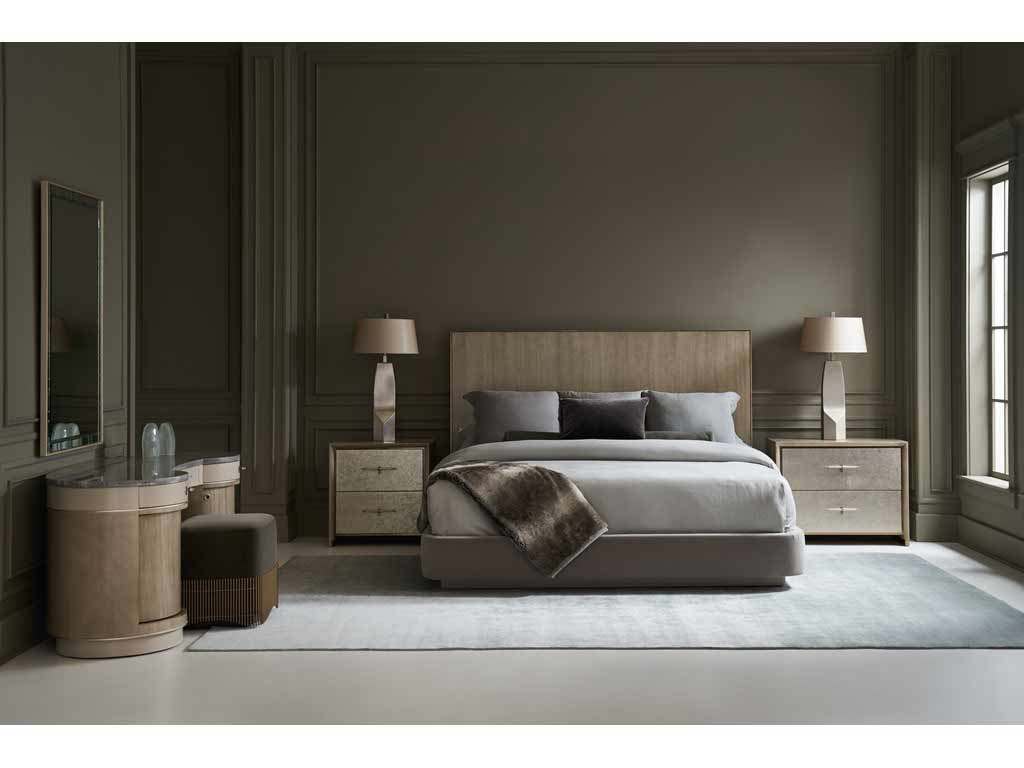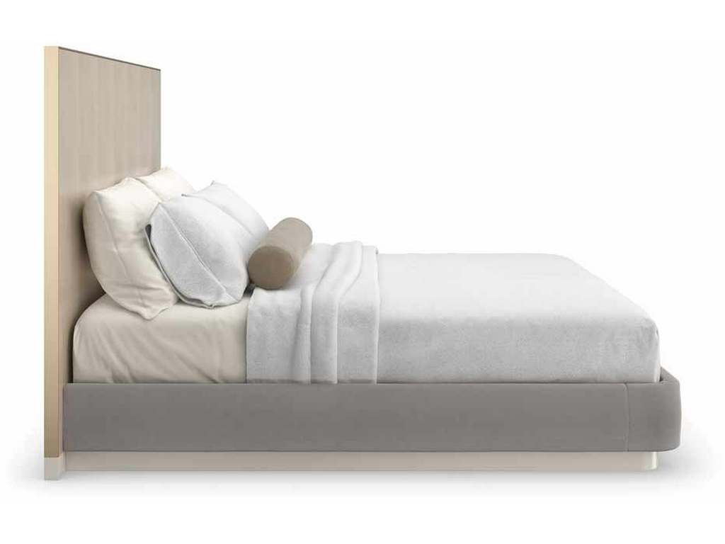 Product Description: Caracole CLA-022-103 Dream Chaser Queen Bed - Rich in material, yet restrained in form, the Dream Chaser bed lends an understated balance of opulence and simplicity. A Dry Martini finish draws attention to its parsons-shaped headboard, crafted from exquisite Koto veneers and encased in Brushed Gold. Dressed in a pale gray mohair fabric, a footboard and side rails with gently rounded corners appear to float on a Cloud-painted plinth base. Also available with curved, wood-paneled wings for a more commanding presence.
