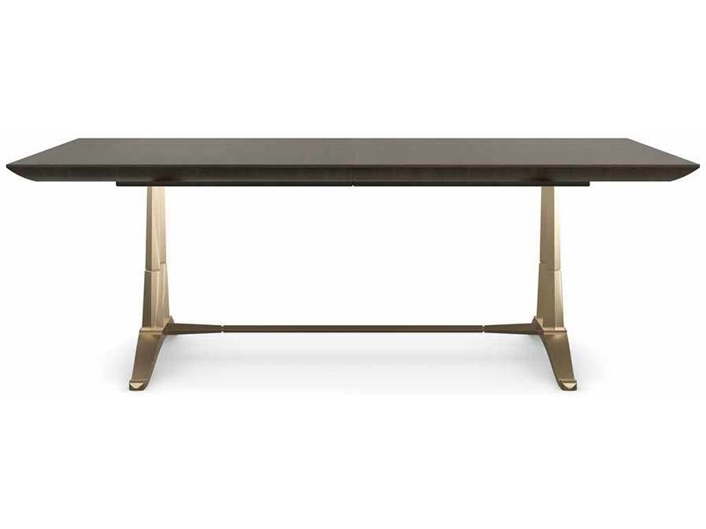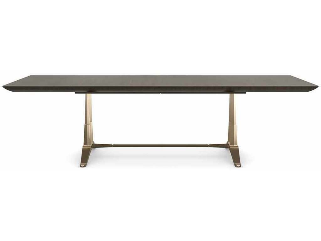 Product Description: Caracole CLA-022-203 D orsay Dining Table - Dually inspired, this modern take on a classic French trestle table recalls the vaulted ceiling of Musee D'orsay, a former Beaux-Arts railway station, and the elegance of a slipper with the same name. Balanced on its Champagne Gold metal frame, an expansive tabletop warms the room with richly grained, tupelo veneers in an Otter finish. Expands to 112 with a single leaf for impromptu parties and surprise dinner guests.