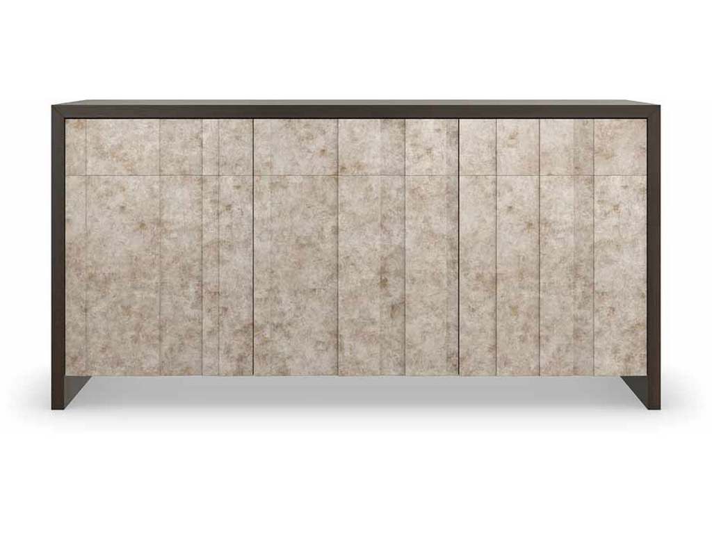 Product Description: Caracole CLA-022-211 Caracole Classic Golden Hour Sideboard - With a warm shimmer reminiscent of mica minerals, this multifaceted sideboard introduces an interplay of light and shadow. Applied by hand, Intricately pieced silverleaf wraps touch-latch doors and drawers of varying dimensions for added depth and reflection. Its Dark Chocolate-painted interior features adjustable shelves behind each door for streamlined storage, intentionally styled to make a statement in any interior.