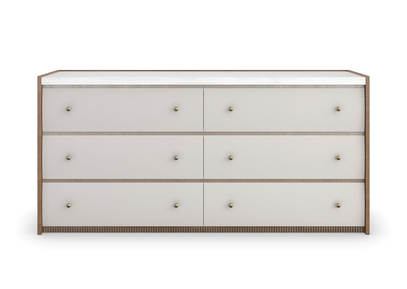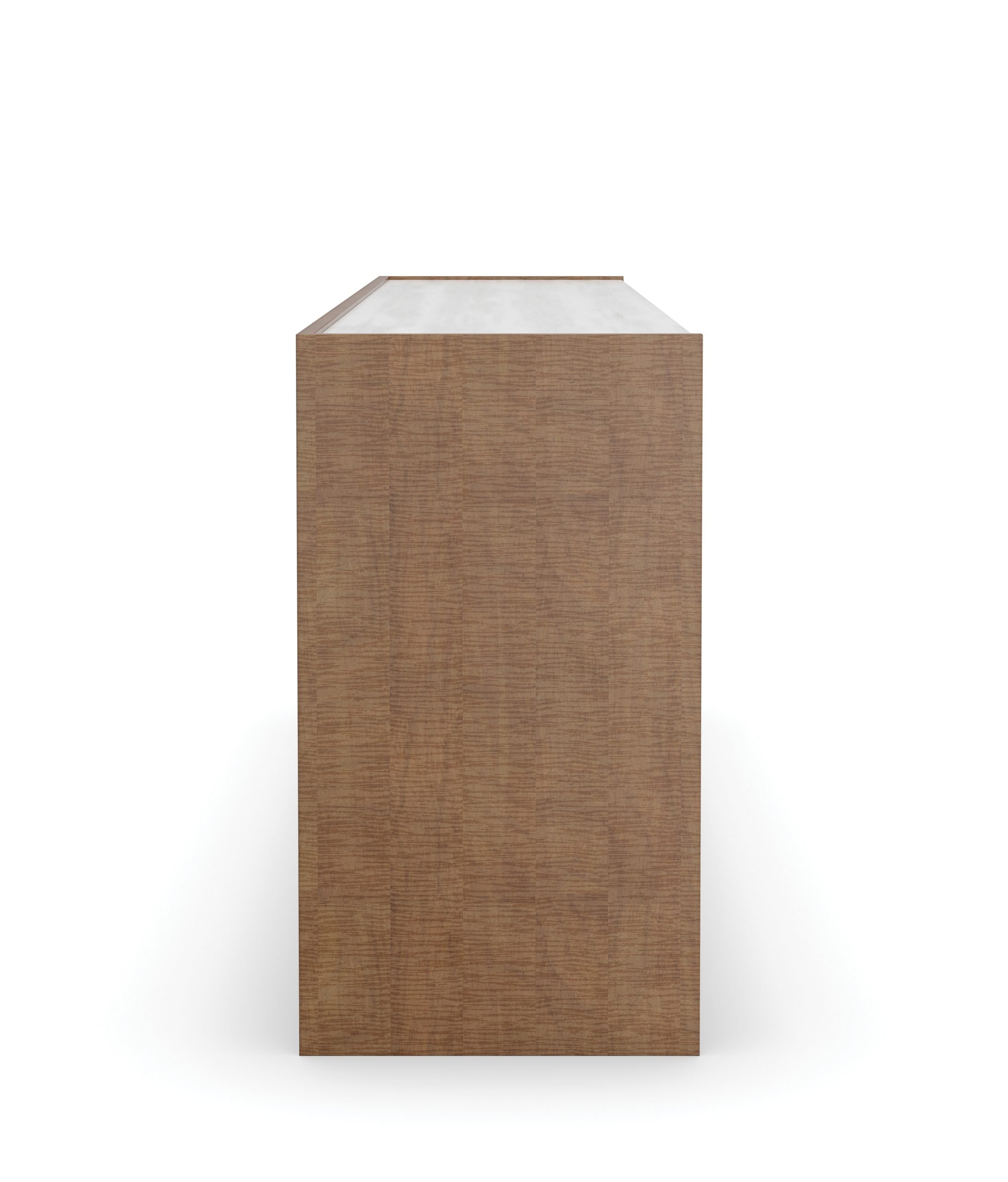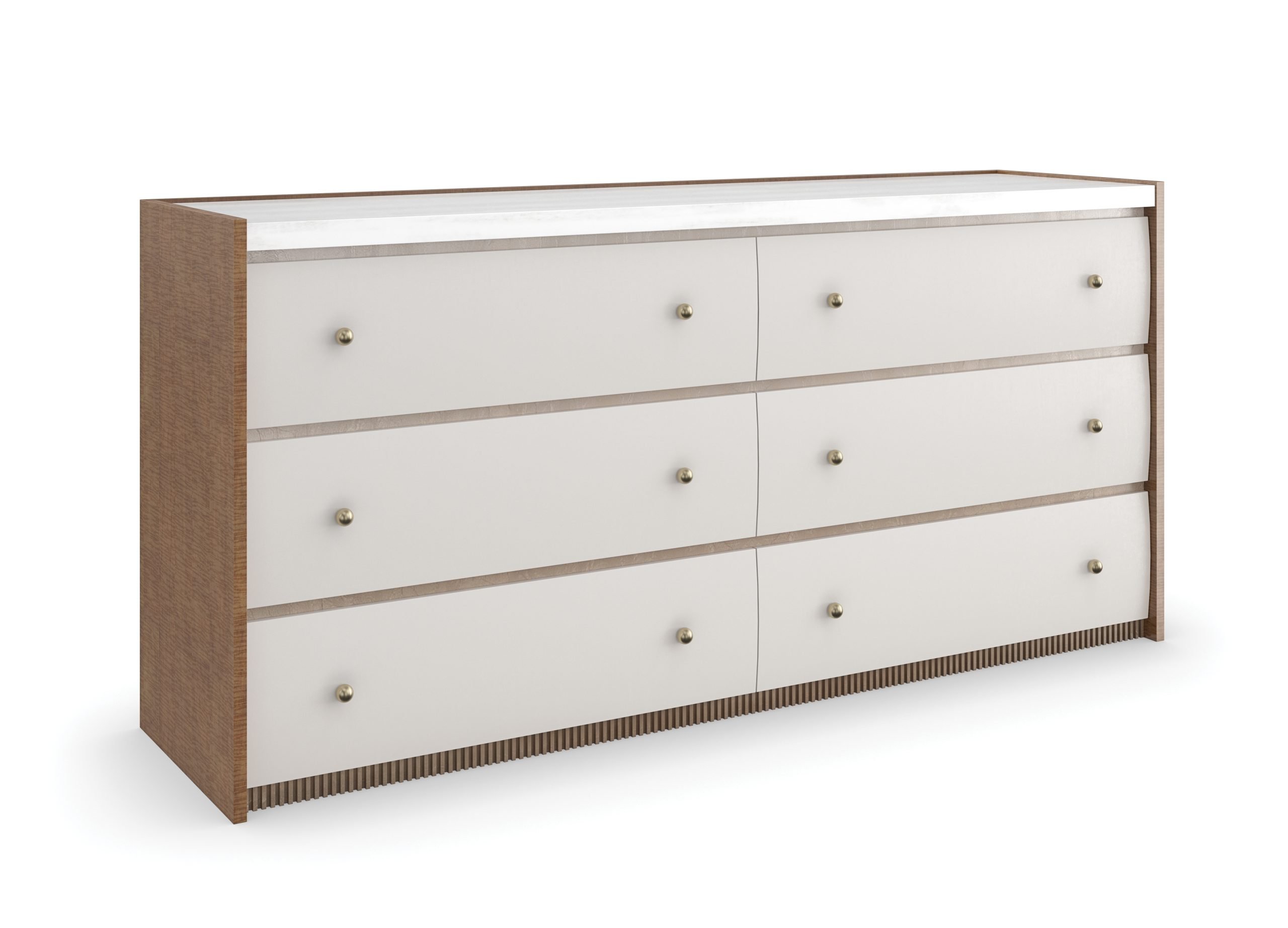 Product Description: Caracole CLA-023-012 Avignon Dresser - With a rustic elegance reminiscent of rural France, this dresser features tactile drawer fronts in a Rockport Burnished Adobe finish. Drawing the eye to its architectural design: a striated white onyx marble top, warmly contrasted by end panels in Toasted Sycamore and an Antique Bronze Leaf dentil molding detail along the base. Features six spacious drawers with painted interiors and ball hardware in Brushed Gold for an accentuating element that ties it to our Provence bed.