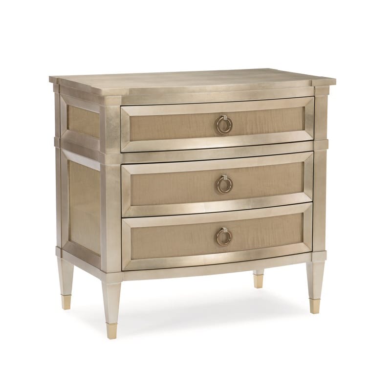 An elegant storage solution, this three-drawer nightstand offers updated traditional styling that complements the design of any bedroom suite. Crafted of Fumed Figured Tiger Maple, it's finished in Smoke and features a Taupe Silver Leaf top. You'll enjoy the lovely silkscreen trellis pattern on the inside bottom of its top drawer every time you open it. Metal ferrules add a finishing touch and coordinate beautifully with other metallic finishes in the space.