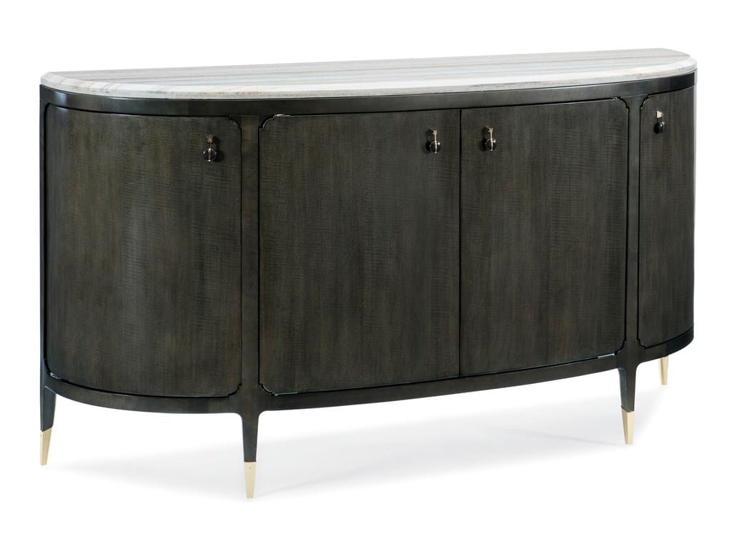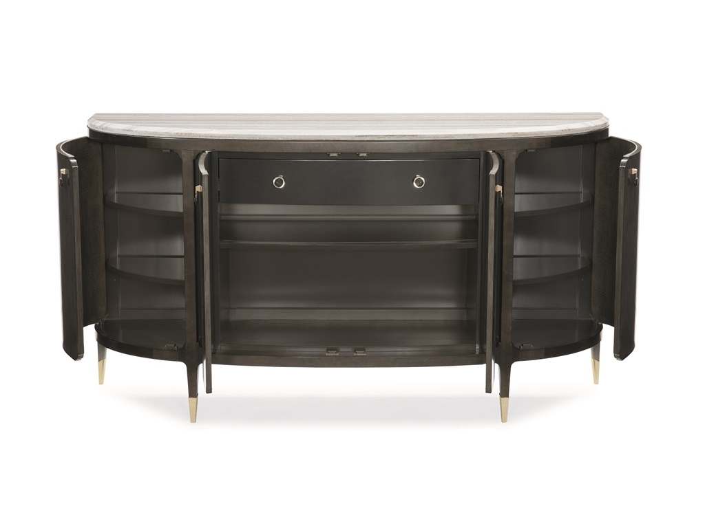 Product Description: Caracole CLA-417-214 Caracole Classic Serve Yourself - A vision in the beauty of contrast, this fascinating half-moon console wears a dark, Charcoal Anegre finish and a Blue Sandstone top. Each of its four doors is highlighted by jewelry-like pulls and opens to reveal a Seal Skin interior. Inside, a storage drawer and adjustable shelves ensure everything has a place. With dramatic charm, its modern attitude is assured with the addition of metal ferrules in Whisper of Gold. This is just the piece to design a room around.