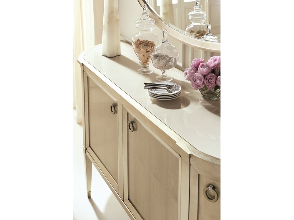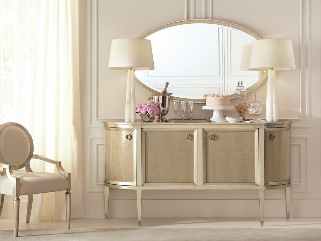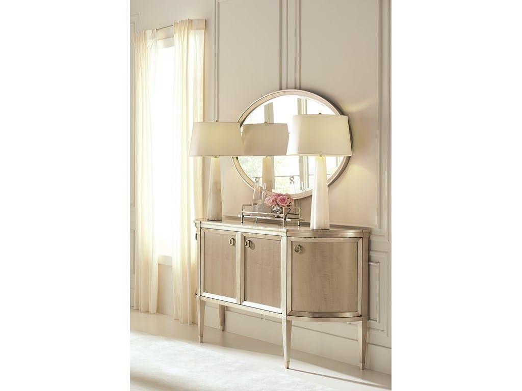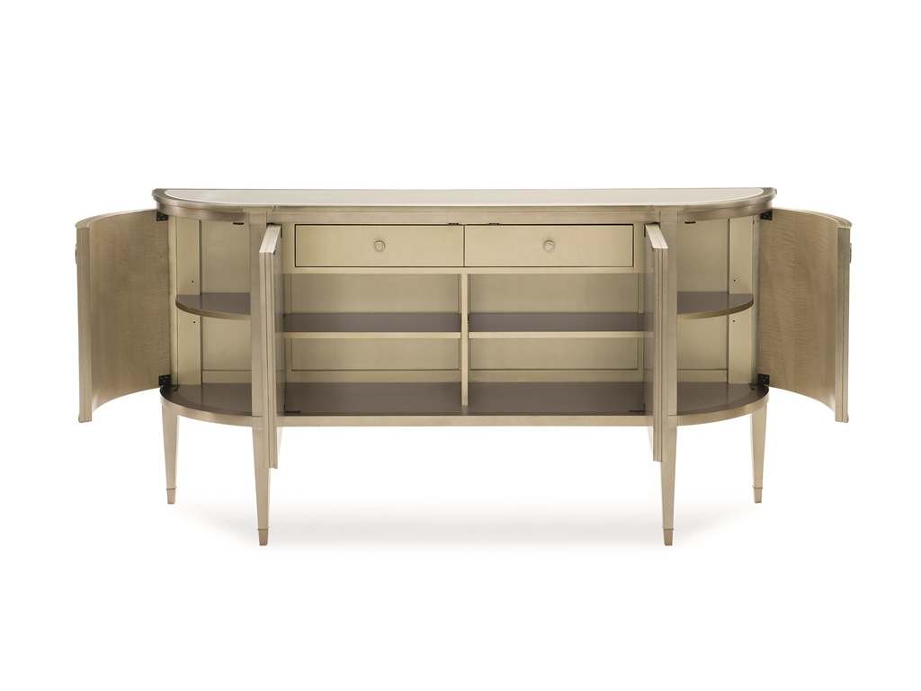 Product Description: Caracole CLA-417-682 A Door It - A classic reinvented, this glamourous half-moon-shaped, four-door credenza makes organization effortless. Its classically updated aesthetic is achieved with Fumed Figured Tiger Maple finished in Smoke and accented with Taupe Silver Leaf. A cream stone inset top encourages buffet serving. Adjustable shelves can be found inside, as well as a drawer with silver tray and two additional drawers. Drawer bottoms silkscreened with a trellis pattern add to the elegant appeal of its stylish interior. Panels in Smoke with solids and frames in Taupe Silver Leaf. Top frame with inset cream stone top. One adjustable shelf behind each door. Left drawer with silver tray. Drawer interiors in Platinum.