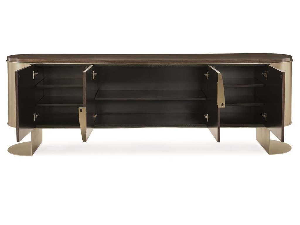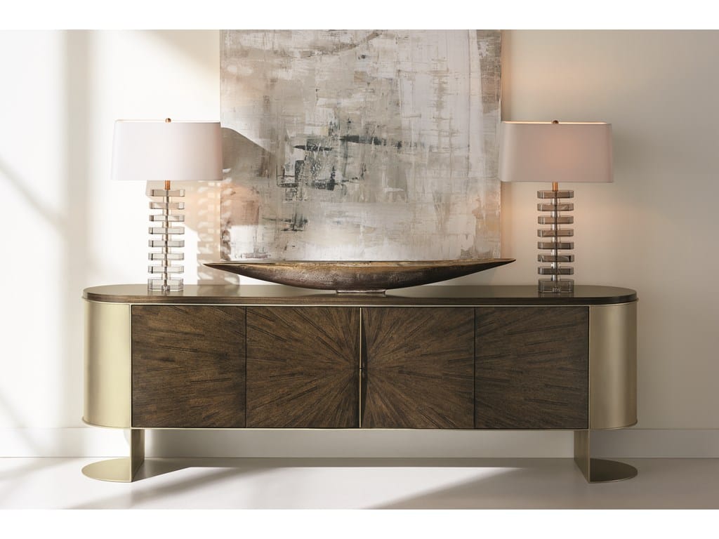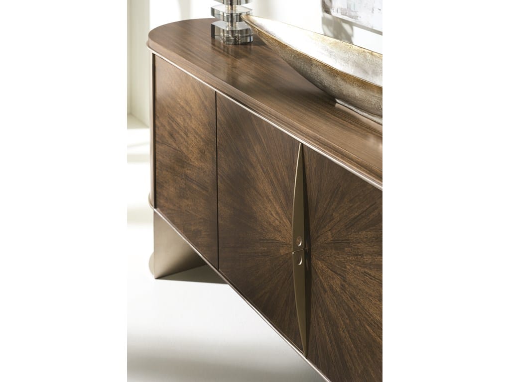 Product Description: Caracole CLA-418-531 Caracole Classic Prime Time Console - Handpicked for its uncompromising style, this credenza is destined to become a room's focal point. You can't help but stare at its unforgettably stylish doors crafted of radial matched Paldao veneers. Its metal frame and curved ends feature an exquisite Golden Blonde Leaf finish while its top wears a rich Galway finish. You'll find an adjustable shelf behind the center doors. The resulting look is one of refreshing reinvention rich with character.