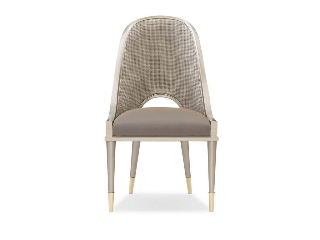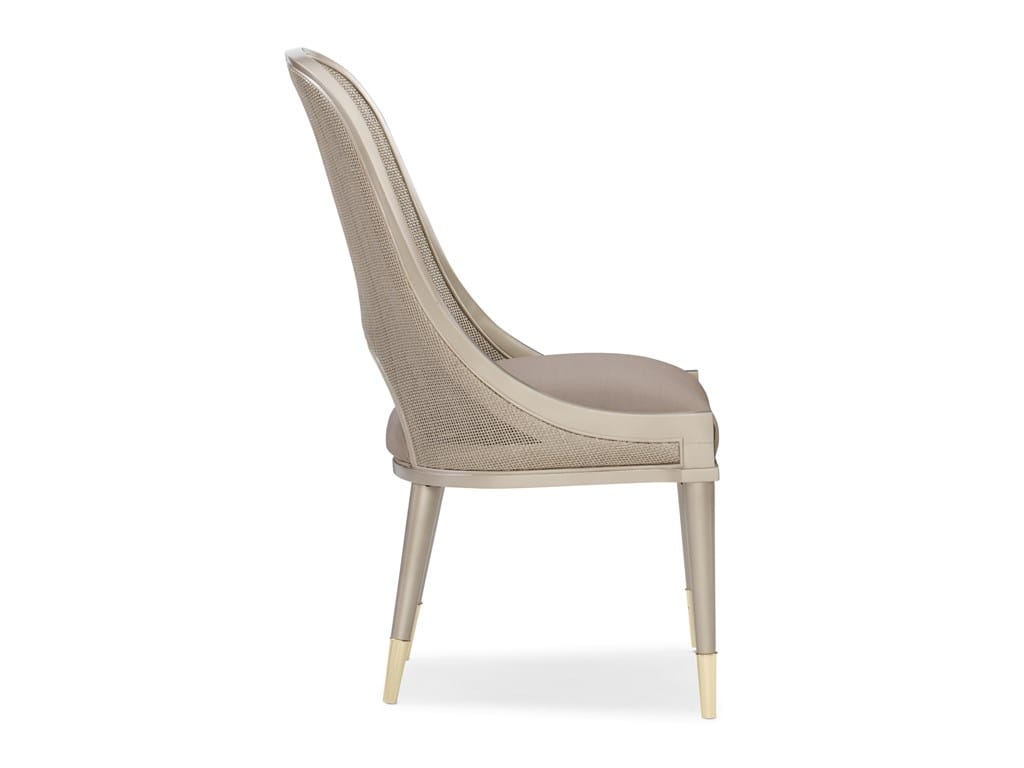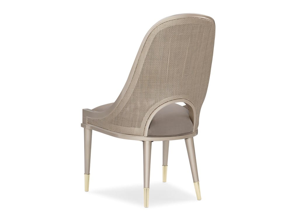 Product Description: Caracole CLA-419-287 Cane I Join You Dining Chair - For traditional style with an updated appeal, look no further. This iconic chair offers a casual interpretation of classic British West Indies-style caning. Its modernized shape features an open back cut-out and is accentuated by woven cane on its back and frame highlighted with a Neutral Metallic finish. Upholstered in a rich neutral, it's the perfect choice for adding character to any space.