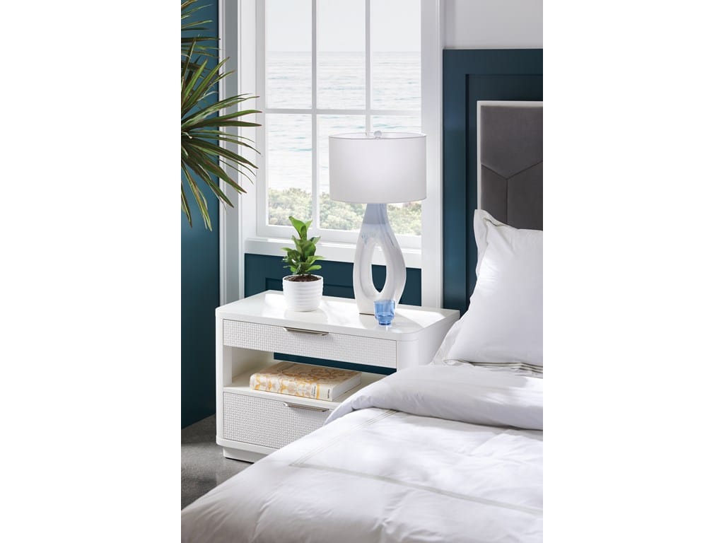 Product Description: Caracole CLA-421-062 Caracole Classic In Touch Bedside Table - Rounded edges soften this clean-lined bedside table, quietly captivating in a Cloud White finish. Carved drawer fronts add tactile appeal with a woven mini-tile motif, accentuated by finger-cup pulls in Satin Nickel. Features two drawers and open center storage with a built-in light. A USB port and cutouts in the back let you charge devices and keep cords out of sight.
