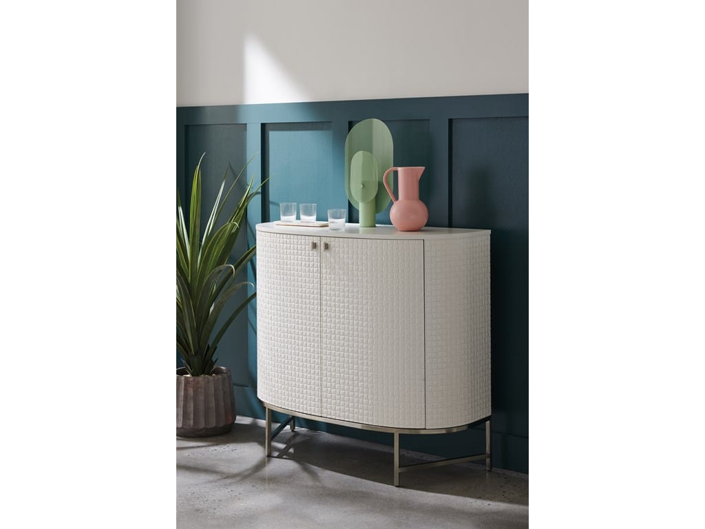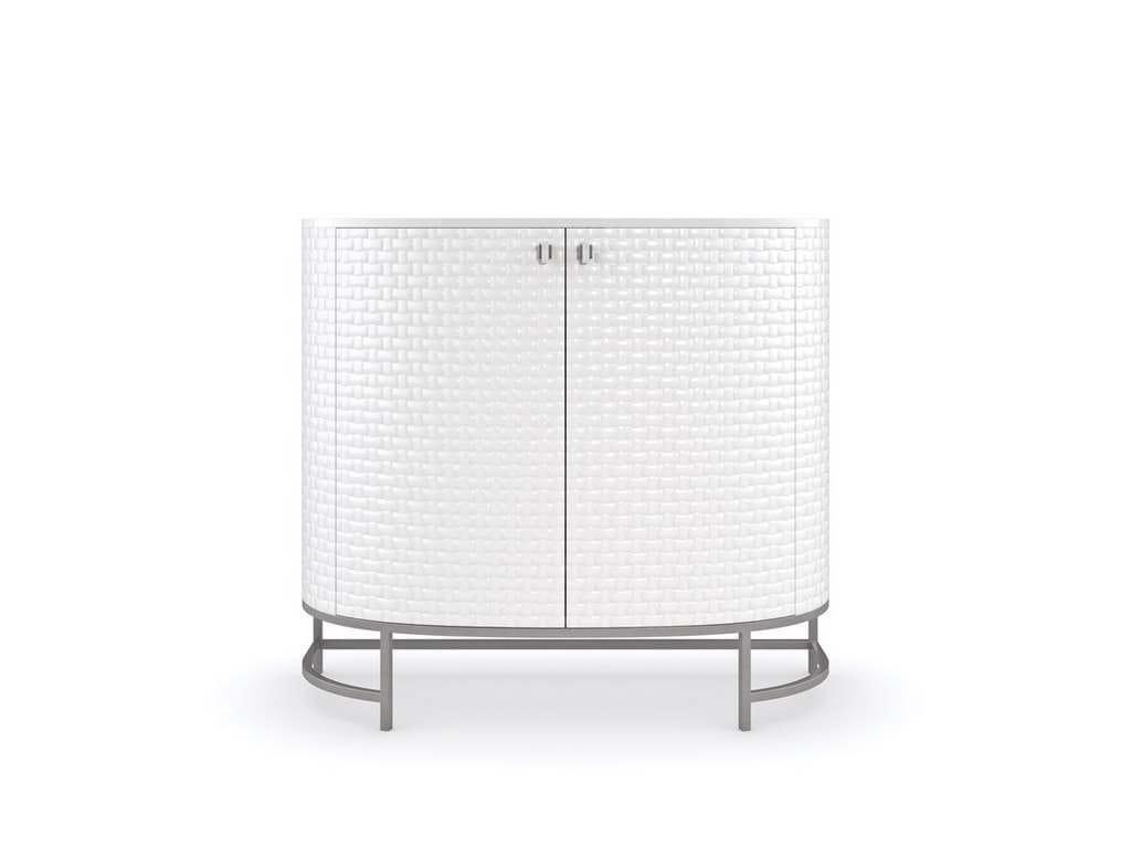 Product Description: Caracole CLA-421-461 Caracole Classic Here To Serve Bar Cabinet - With its graceful shape and tactile appeal, this demilune bar is proof that good design makes the everyday extraordinary. Beautifully balanced on a Satin Nickel metal base, it features carved door fronts with a woven tile motif, inspired by an intricate pattern found on a marble stone hearth. Made for entertaining, this cabinet offers ample space for storage, including a single, soft-close drawer and glass shelf with lightly chamfered, polished edges.