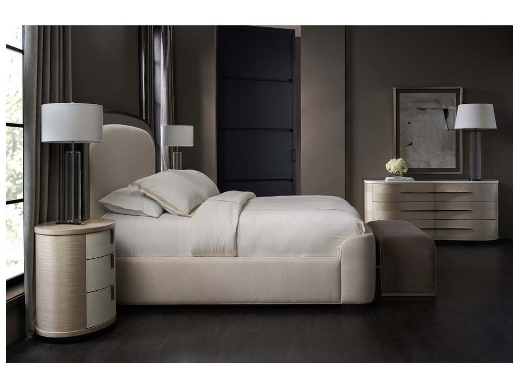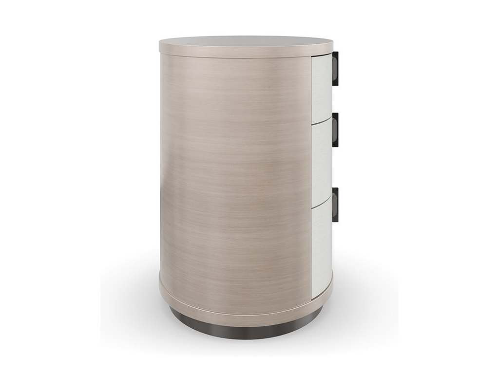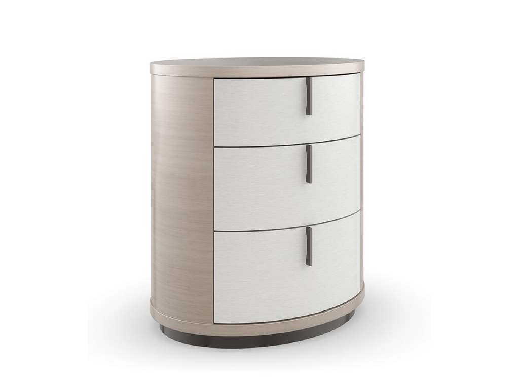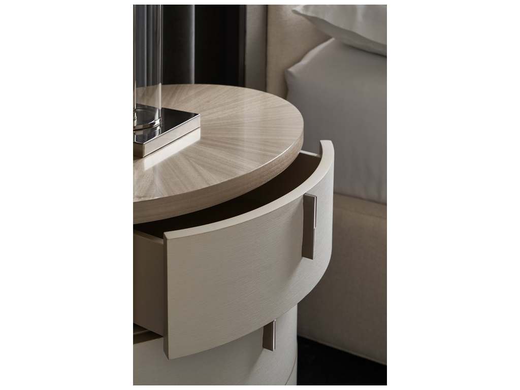 Product Description: Caracole CLA-422-064 Caracole Classic Wandering Nightstand - Elliptical in shape, this small-scaled nightstand introduces an alluring form with organic simplicity. A pearlescent Moonstone finish highlights the intricate wood grain of Koto veneers, intricately pieced to create a radial pattern on top. Vinyl-wrapped drawer fronts lend crisp contrast, accented by sleek vertical hardware in a Deep Bronze finish.
