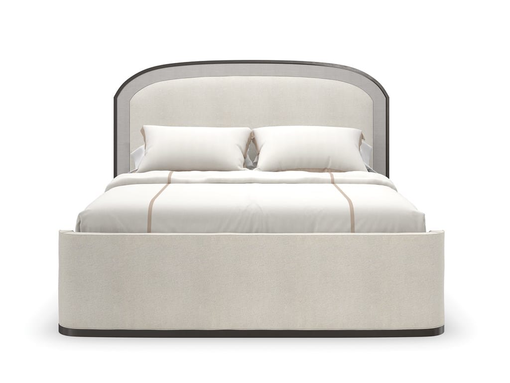 Product Description: Caracole CLA-422-102 Caracole Classic Wanderlust Queen Bed - With a subtle nod to the grandeur of Art Deco, this upholstered bed introduces a harmonious mix of neutral hues, textures, and materials. Features an arched headboard accentuated with Sun-kissed Silver raffia, trimmed in Deep Bronze and wood banding in a Seal Skin finish. Elevated on a wood plinth base, its side rails and gently curving footboard are fully upholstered in an inviting, ivory textured woven.