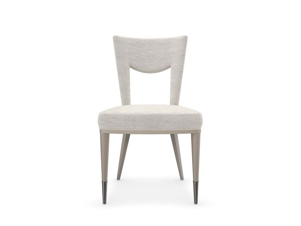 Product Description: Caracole CLA-422-284 Caracole Classic Strata Dining Chair - Delicately scaled with a subtle curve to its open back, this upholstered chair makes an elegant statement from dining table to vanity or desk. Finely tailored in an inviting ivory woven, it lends tactile appeal and a hint of shimmer in a Sparkling Argent finish. Conical front legs are capped in Deep Bronze metal ferrules for added contrast and a note of distinction. Legs and exposed seat rail trim in Sparkling Argent. Metal ferrules in Deep Bronze.