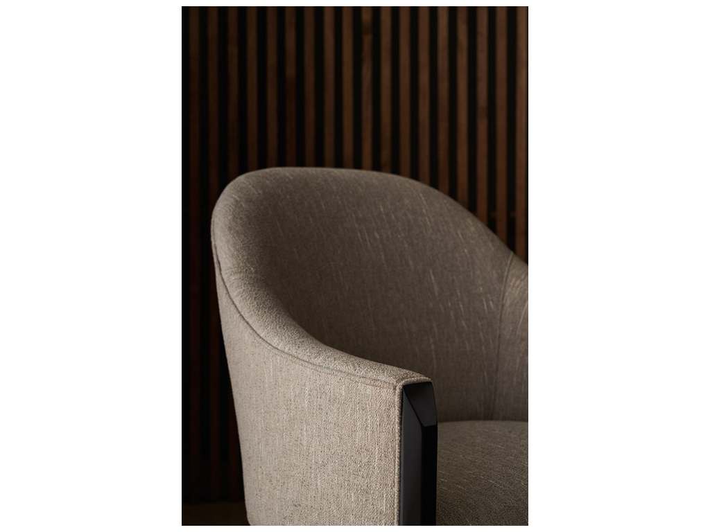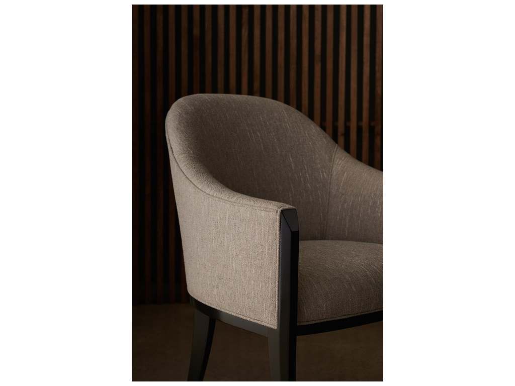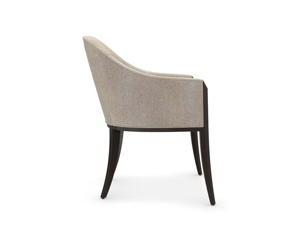 Product Description: Caracole CLA-422-291 Next Course Dining Chair - Warm and welcoming in a silver textured woven, this dining chair invites guests to linger around the table. Comfortably curved with a refined barrel back, it features sloping slim arms, accentuated by a faceted post in a richly contrasting Dark Chocolate finish. A classic seating silhouette that compliments today's dining interiors with effortless elegance