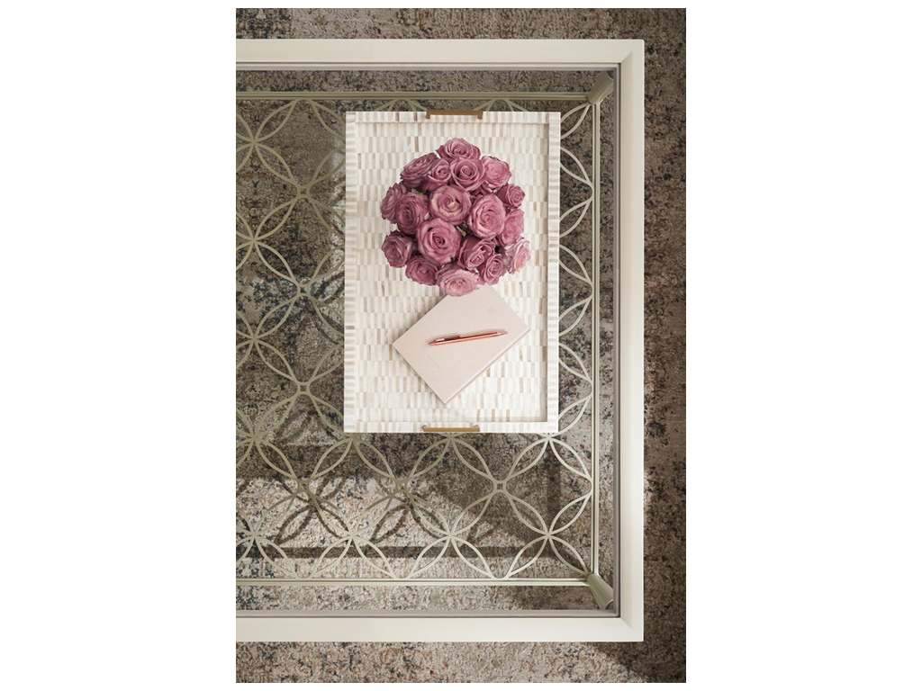 Product Description: Caracole CLA-422-401 Caracole Classic Works Like A Charm Cocktail Table - This charming cocktail table makes an effortless yet elegant statement in spaces designed for conversation and entertaining. A clear glass top lends a striking view of its open fretwork metal shelf, finished in Soft Silver paint for added reflection. Its Crème de la Crème painted wood frame is accentuated by turned legs, dressed in metal ferrules and a Gold Bullion Leaf decorative collar.