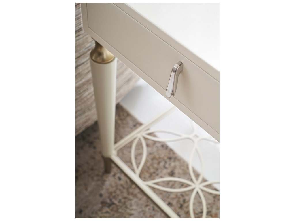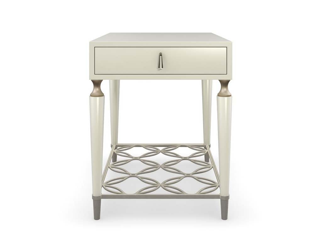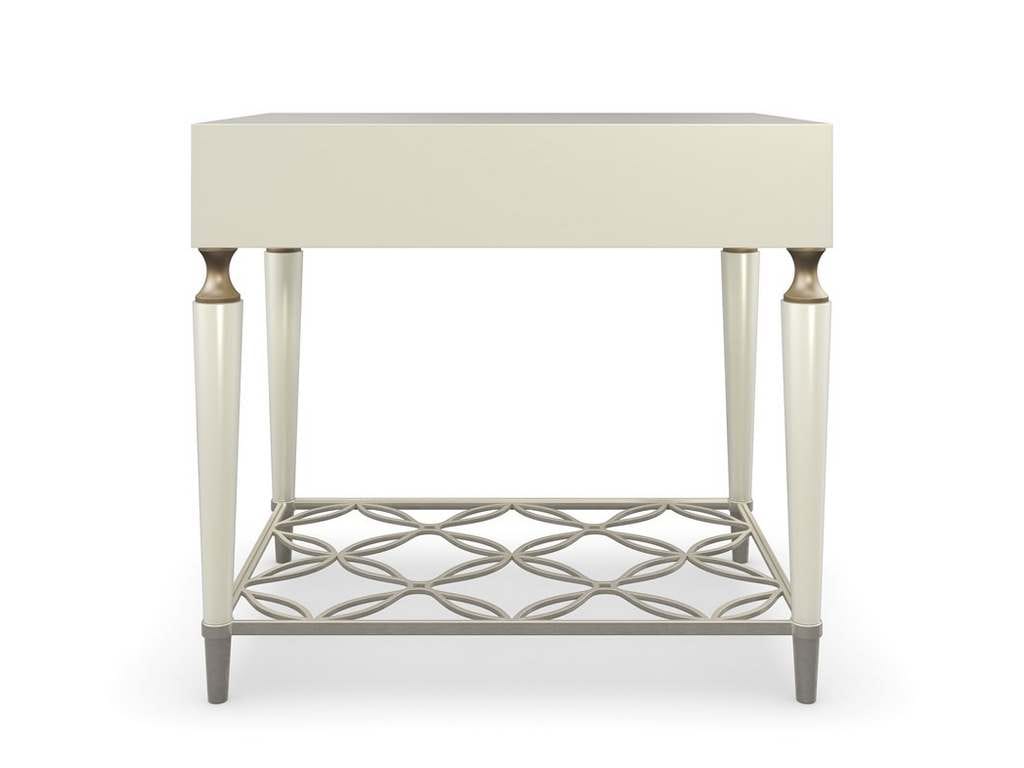 Product Description: Caracole CLA-422-411 Charming To The End Table - A charming companion alongside sofas and chairs, this classic end table makes an elegant statement. Striking lattice-patterned metal fretwork on bottom shelf, finished beautifully in Soft Silver paint. Smartly scaled for display, serving or storage, its neutral Crème de la Crème painted wood frame beautifully blends with any occasion or setting.
