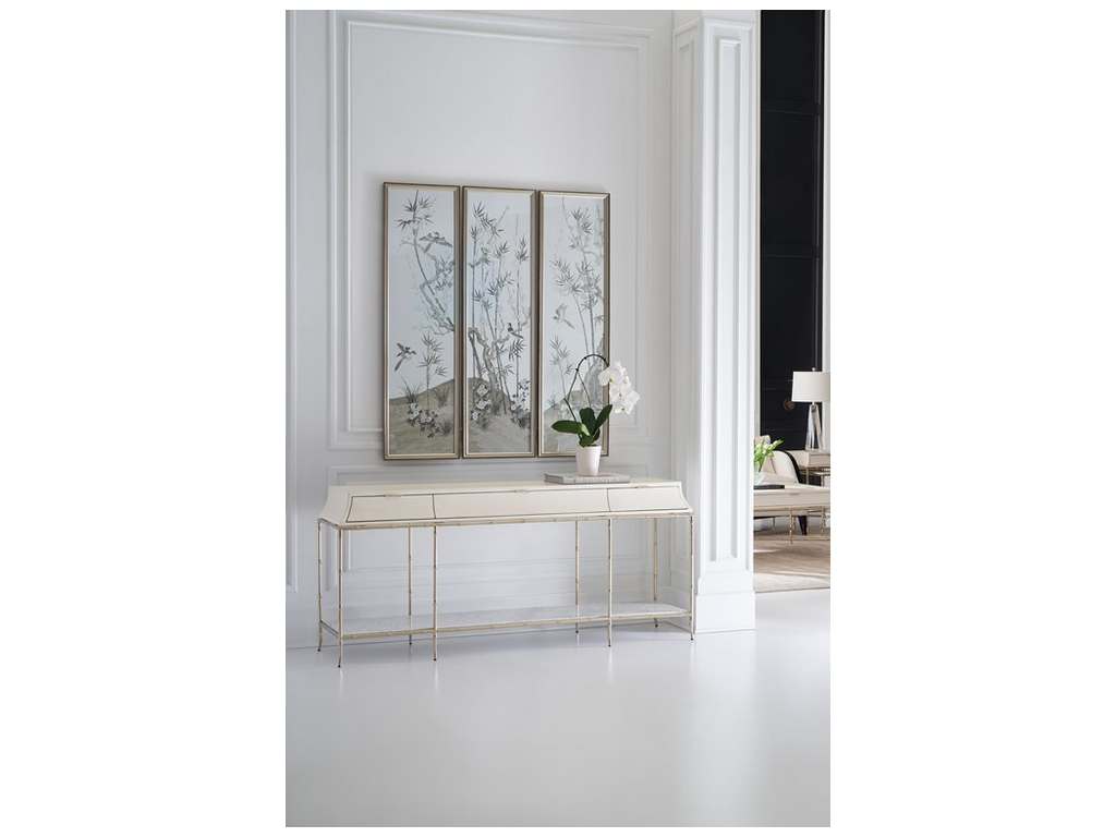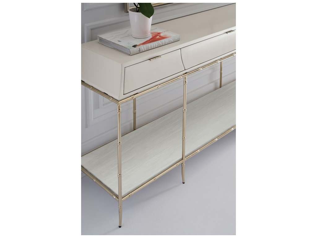 Product Description: Caracole CLA-422-442 Caracole Classic Oolong Console - Making a memorable entrance, the Oolong console beautifully blends modern materials with traditional Asian design influences. Its simple yet elegant form features an elongated, Pagoda-style drawer box painted in Almond Milk. Offers ample tucked-away storage with three slender drawers and open space beneath courtesy of a Carrara white marble shelf set within its faux bamboo metal frame.