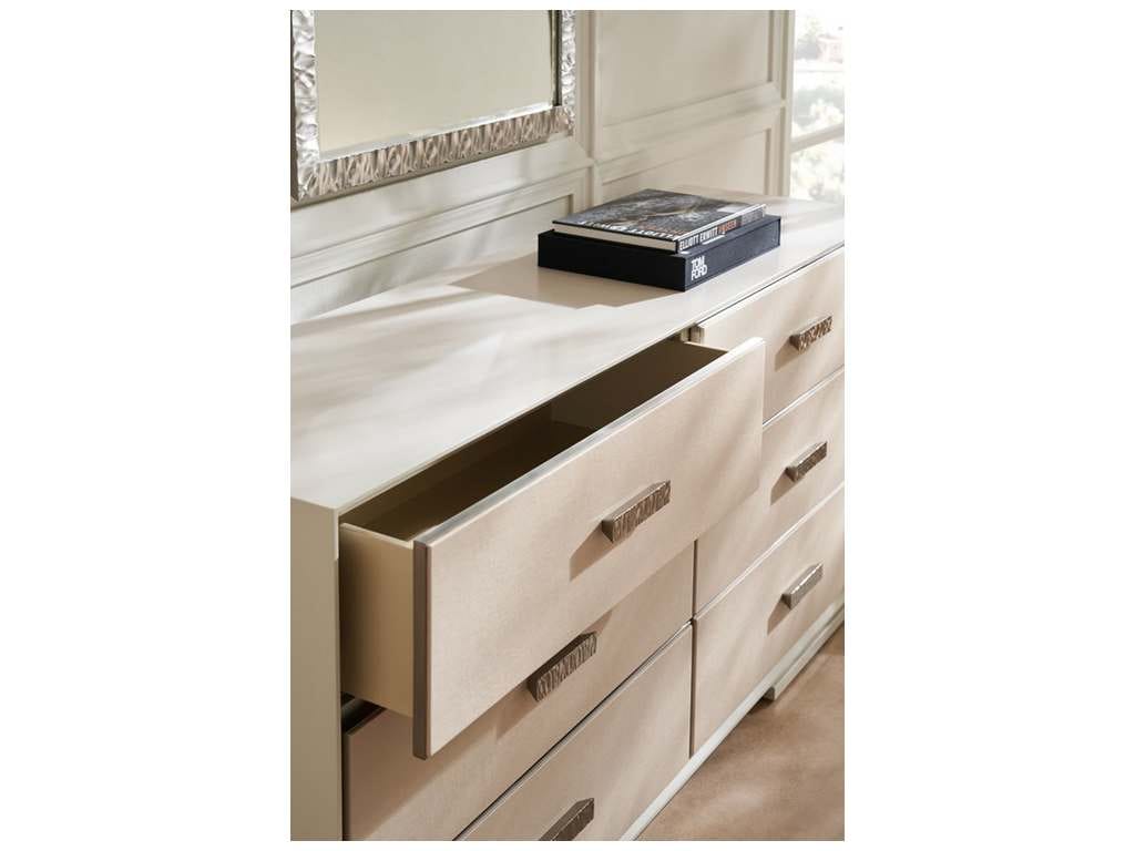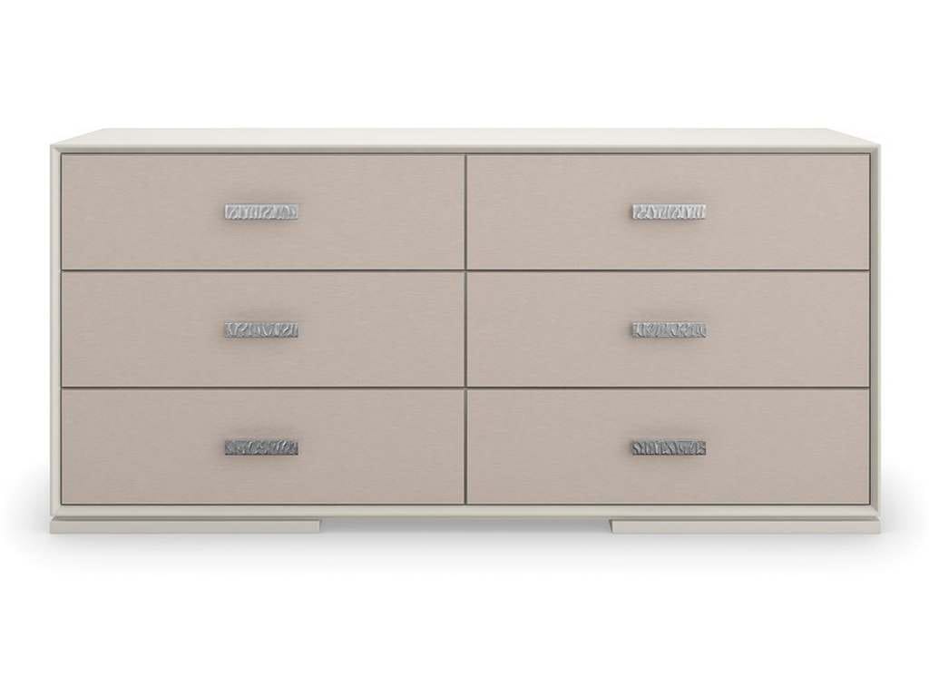 Product Description: Caracole CLA-423-012 Caracole Classic Silver Lining Dresser - A simple form elevated by luxe materials, this classic dresser brings a hopeful glimmer and sensory experience to bedroom interiors. Inspired by a grand, vaulted dressing room seen by designers while in Milan, vinyl-wrapped drawer fronts are meant to emulate the striation and soft blush color of Venetian silk adorning closet doors. Undulated custom hardware in Brushed Stainless adds tactile appeal, complemented by a lacquered, Almond Milk finish.