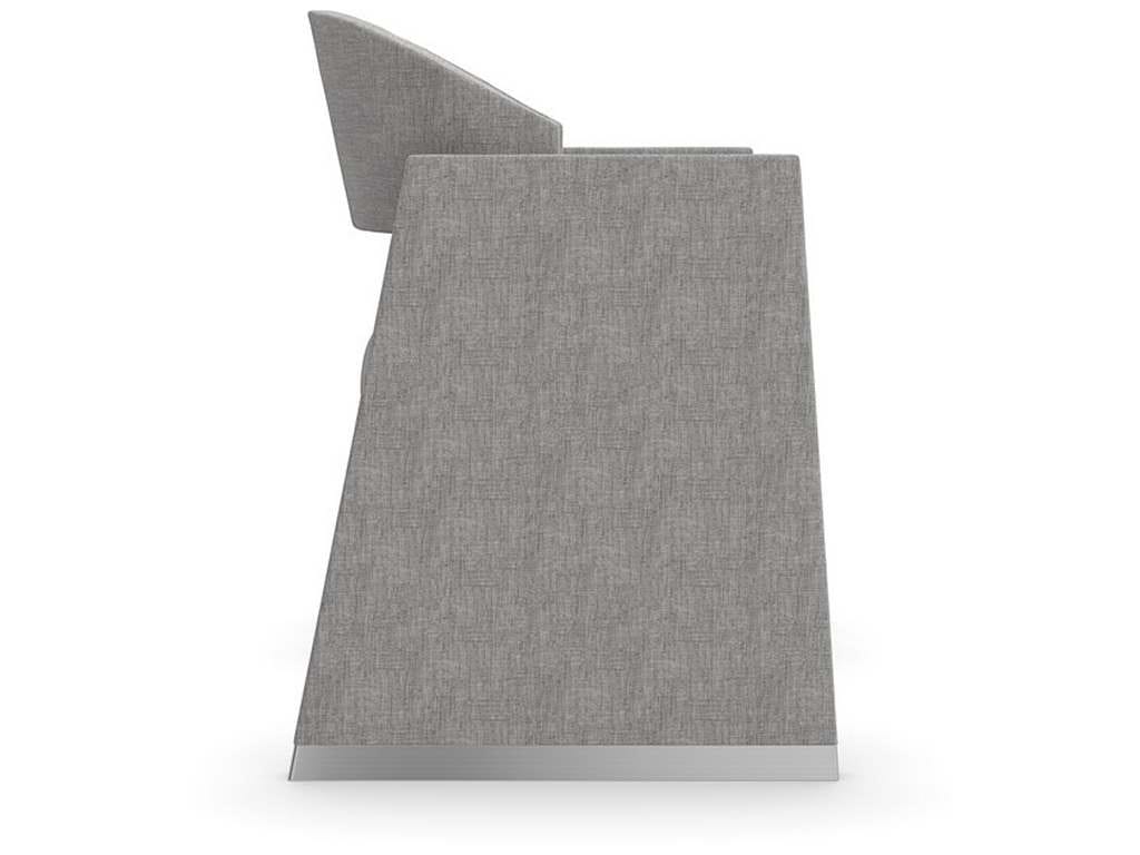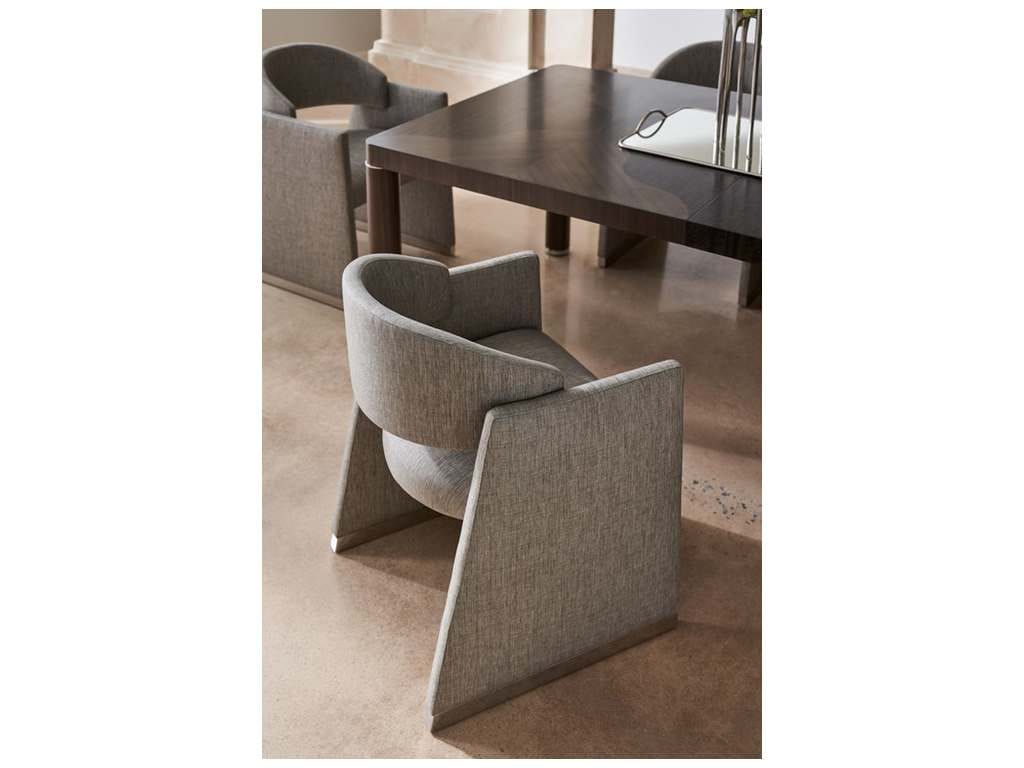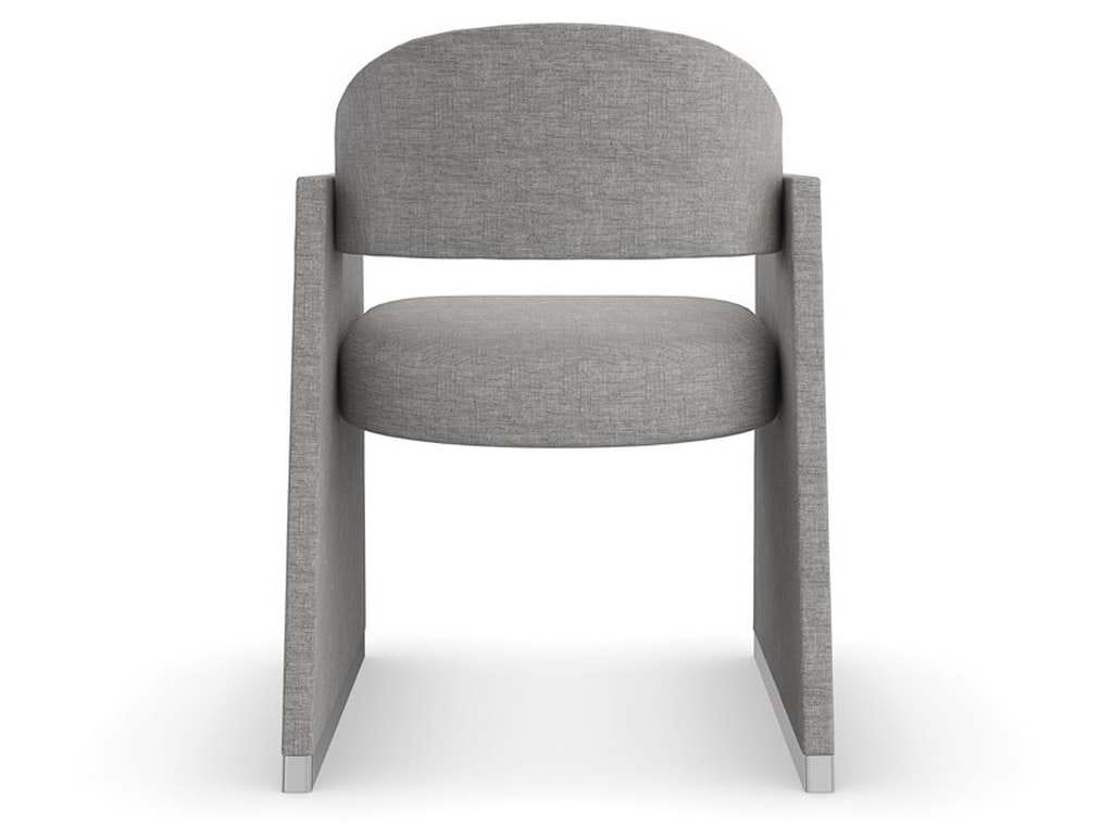 Product Description: Caracole CLA-423-291 Caracole Classic Polish Off Dining Chair - A playful intersection of straight lines and curves, this dining chair makes a sophisticated statement. Dressed in a shimmering gray metallic woven, its geometric shape features trapezoidal side arms with a rounded back and seat that appear to float within two perpendicular planes. For reflection: Polished Silver caps on the legs lend a note of distinction and add to its floating appearance.