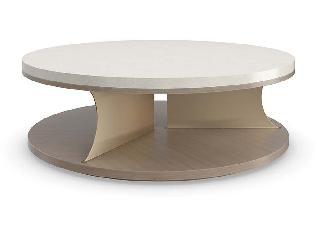 Product Description: Caracole CLA-423-406 Braces Cocktail Table - Understated yet elegant, this artful cocktail table is a celebration of materiality and simple form. Features an ample top in an Ivory Craze crackle finish, supported by a trio of Brushed Gold metal blades, perfectly distributed to create open space for storage and display. A swiveling plinth base adds intrigue and function.