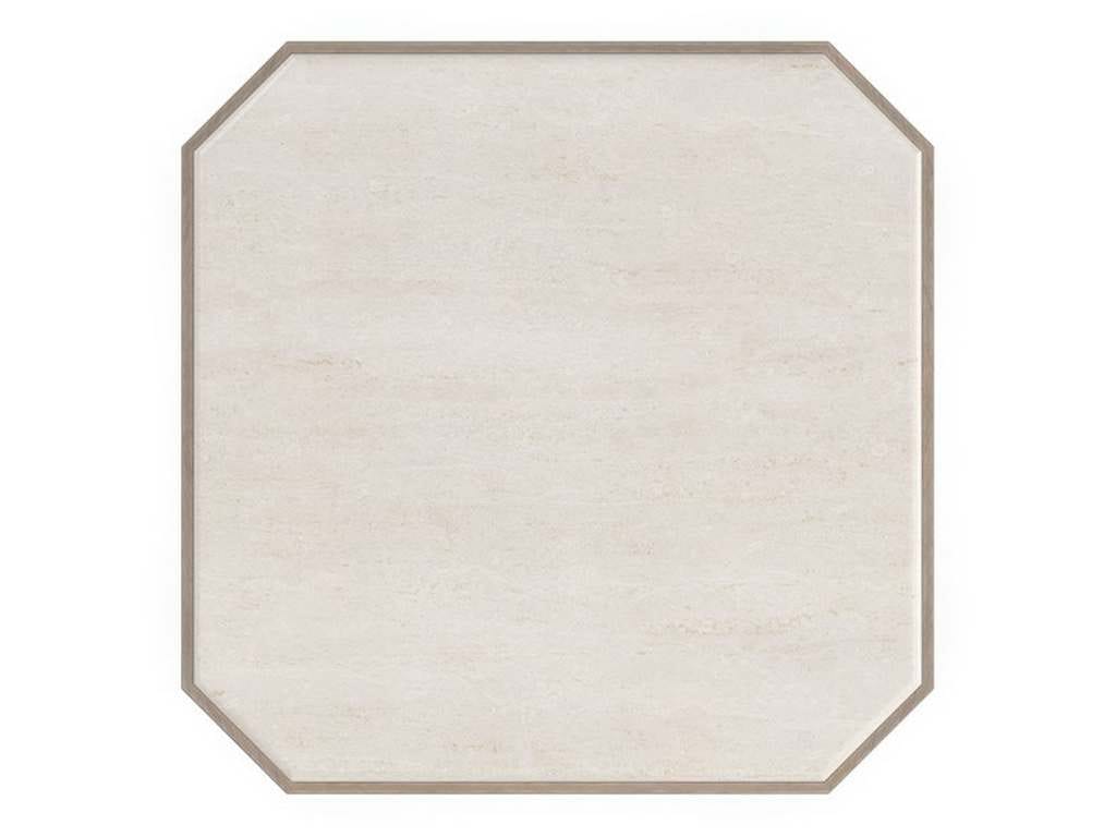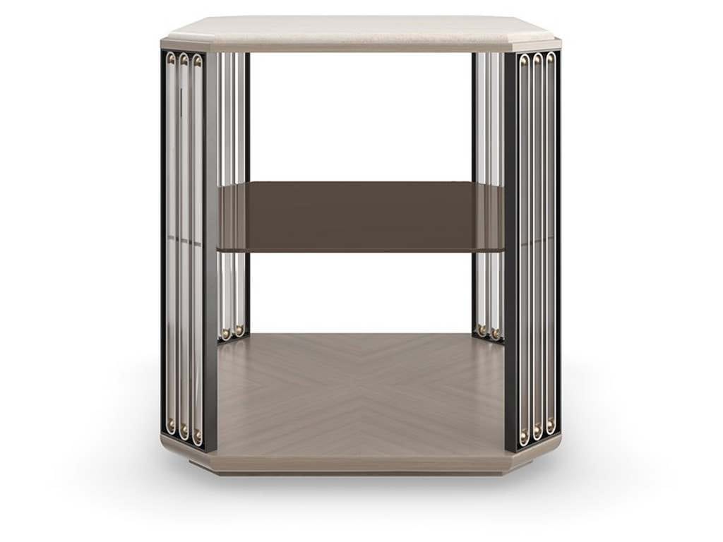 Product Description: Caracole CLA-423-411 Alloy End Table - A seemingly floating glass shelf in a smoky bronze finish adds to the allure of this end table, inspired by the bent metal work of notable French designer Jean Prouvé. Features ornamental legs, meticulously crafted in a fusion of Deep Bronze, Brushed Gold, and Brushed Stainless metals, topped by Crème Travertine stone. Substantial in form, yet airy and reflective, it offers ample open space for displaying art books and objects.