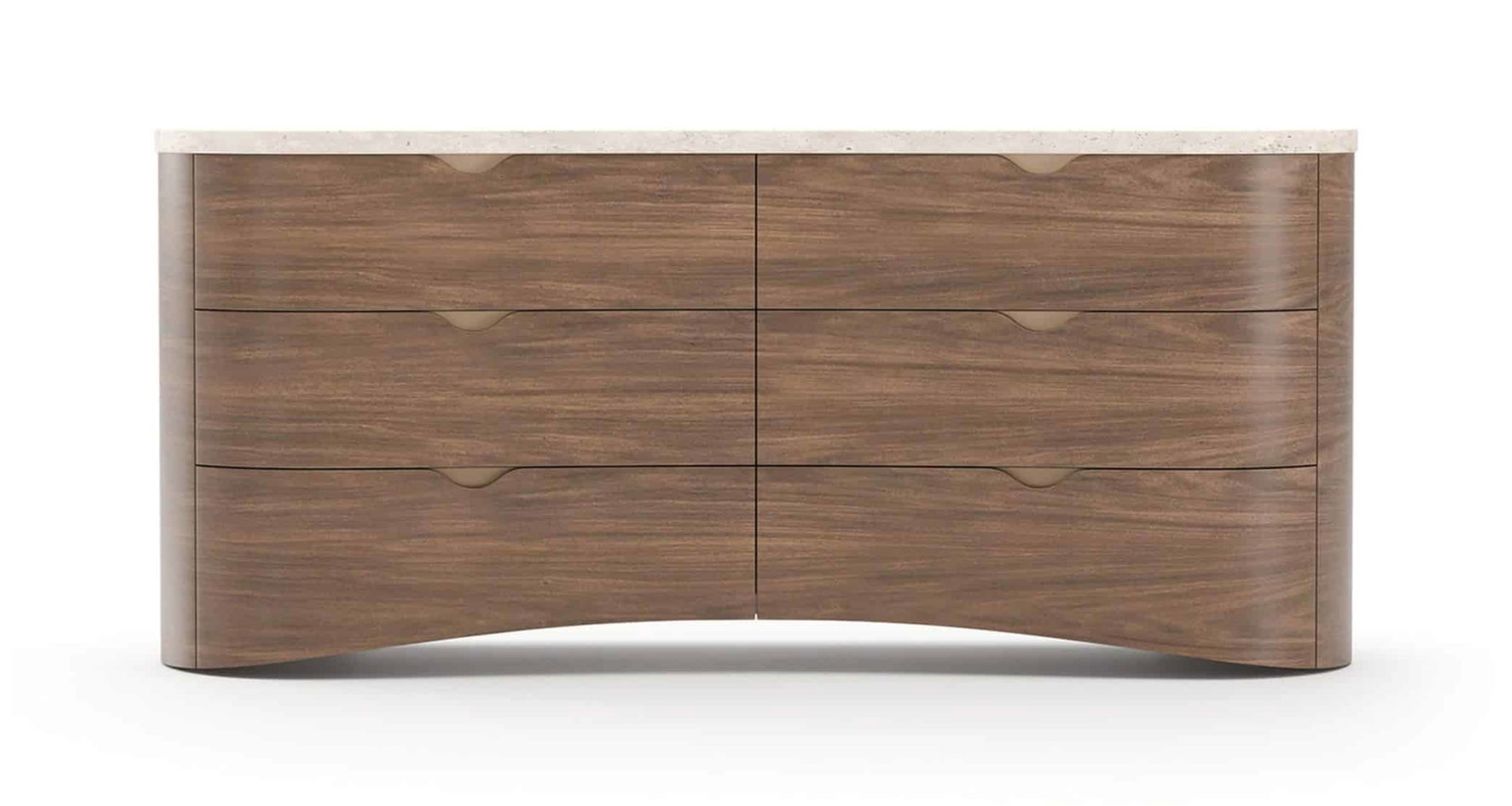 Product Description: Caracole CLA-425V-014 Fleur Dresser - Elevate your bedroom with the sophisticated Fleur Dresser. Crafted with an exquisite, unfilled Travertine stone top, each dresser offers unique natural beauty marked by variations in color, veining, and subtle detailing. Its refined Porcini-finished case complements any decor style, while six spacious drawers featuring UV Snow interiors ensure practical elegance. Accented with striking brushed gold metal hardware, this dresser exudes refined charm and luxurious style. A statement piece, combining natural allure with exceptional functionality.