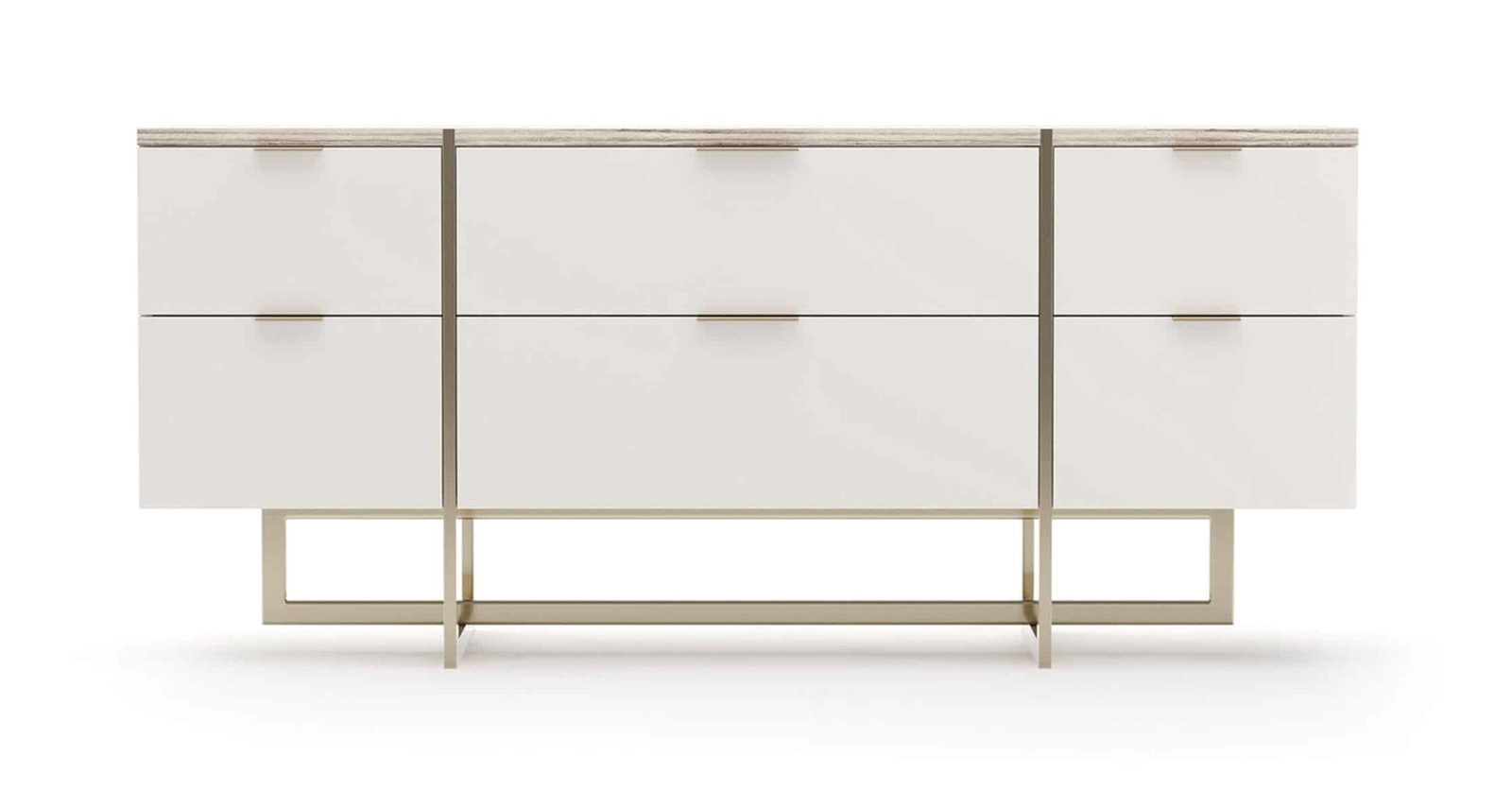 Product Description: Caracole CLA-425V-031 Wish You Were Here Dresser - Inspired by a beloved Caracole icon, the Wish You Were Here Dresser gracefully evolves a best-selling silhouette into a fresh expression of refined elegance. This dresser captivates with its delicate Sandstone top, harmoniously paired with an inviting Almond Milk finish. Elevated upon a striking metal base and adorned with hardware gleaming softly in Whisper of Gold, each of its six spacious drawers opens to reveal beautifully matched Almond Milk interiors. Embrace a piece that's both a nostalgic nod and an exciting new chapter in luxurious design.