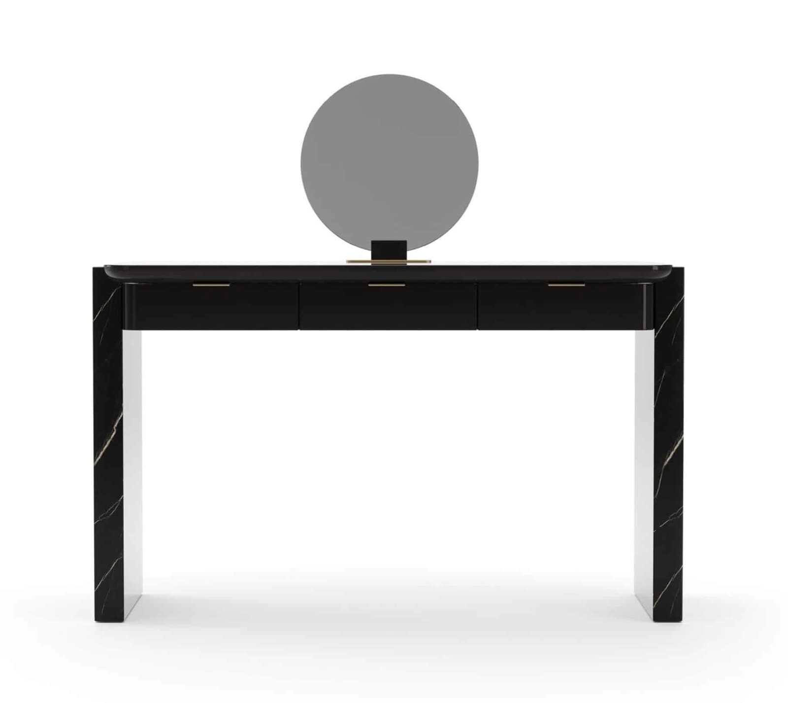 Product Description: Caracole CLA-425V-075 Overlap Vanity Dark - Defined by bold contrasts and timeless elegance, the Overlap Vanity Dark is an epitome of modern luxury. A rich Piano Black finish envelops the top and drawer fronts, strikingly offset by Nero Marquina stone side panels and metal trim in radiant Whisper of Gold. Accompanied by a removable vanity mirror and three thoughtfully appointed drawers with interiors matching its luxurious exterior, this vanity ensures both practicality and sophisticated charm in your living space.
