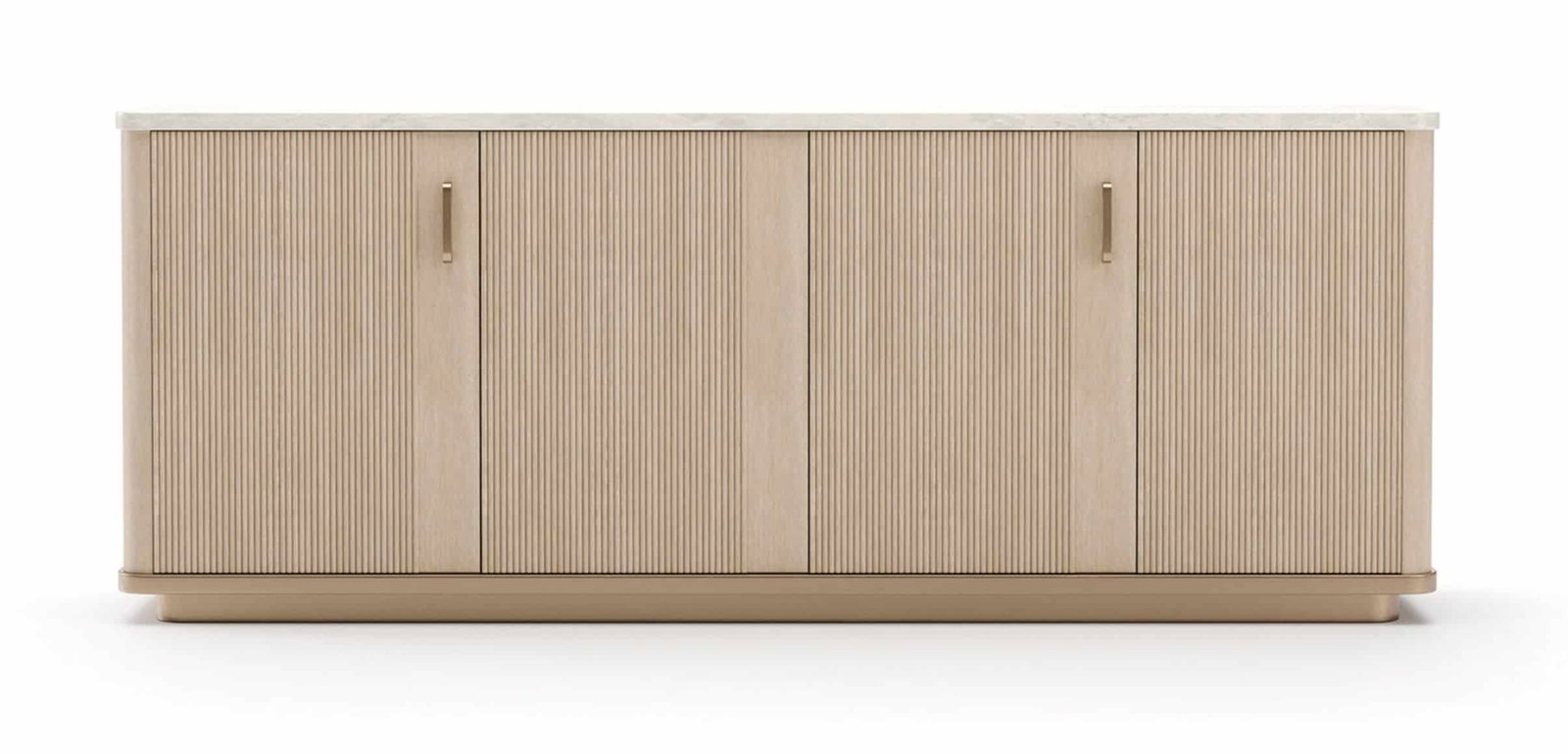 Product Description: Caracole CLA-425V-251 Rhythm Sideboard - The Rhythm Sideboard includes a Travertine stone top, reeded Sun Drenched Oak doors, and a base finished in Neutral Metallic. The spacious interior offers open storage and drawers with UV Linen interiors, combining practical storage and refined detailing.