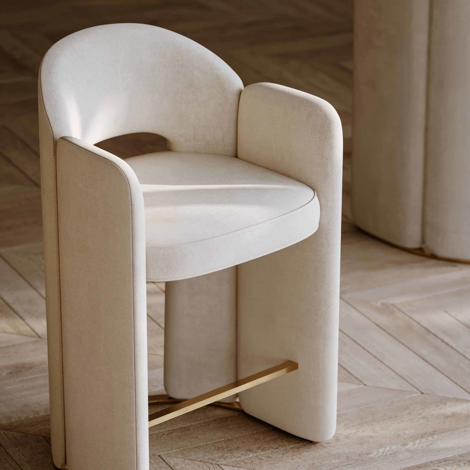 Product Description: Caracole CLA-425V-301 Overlap Bar Stool Ivory - The Overlap Bar Stool Ivory, with its luxurious full upholstery in ivory vintage velvet and delicate metal spline detailing in Whisper of Gold, effortlessly combines comfort and elevated style, ideal for upscale entertaining spaces.