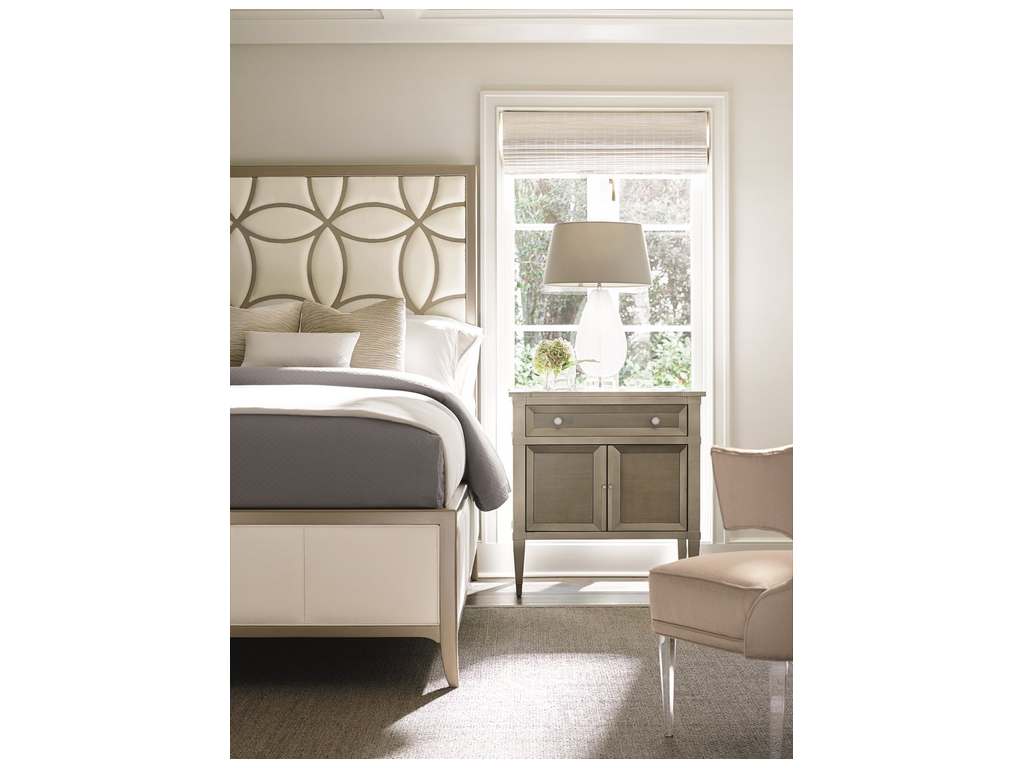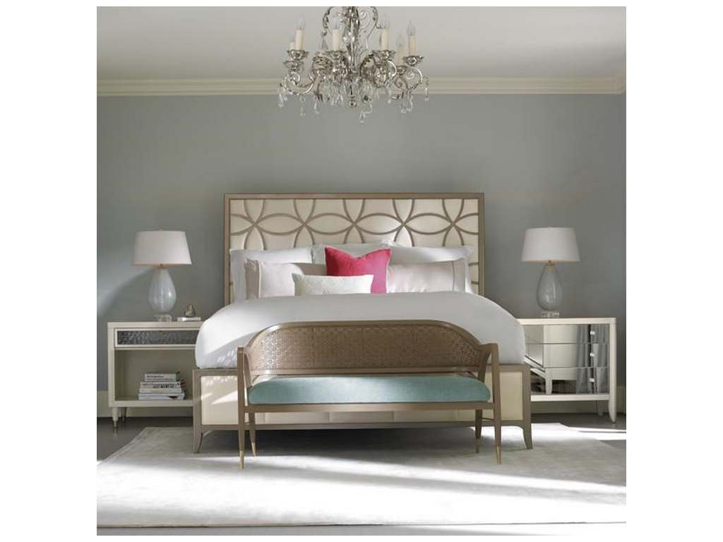 Product Description: Caracole CON-QUEBED-013 Caracole Classic Sleeping Beauty Queen Bed - Drop dead gorgeous and a favorite with our entire design team. There's a hint of iridescence in this fabric upholstered headboard design, the mere finishing touch for a dramatic queen bed that will rise and shine in any bedroom. The fashion-forward frame's unique, contemporized trellis pattern is over-scaled and set off by a rich Taupe Paint finish. This standout combination of white and taupe will look beautiful paired with a variety of wood finishes or metallic elements on other furnishings, for creating the fairest room of all.