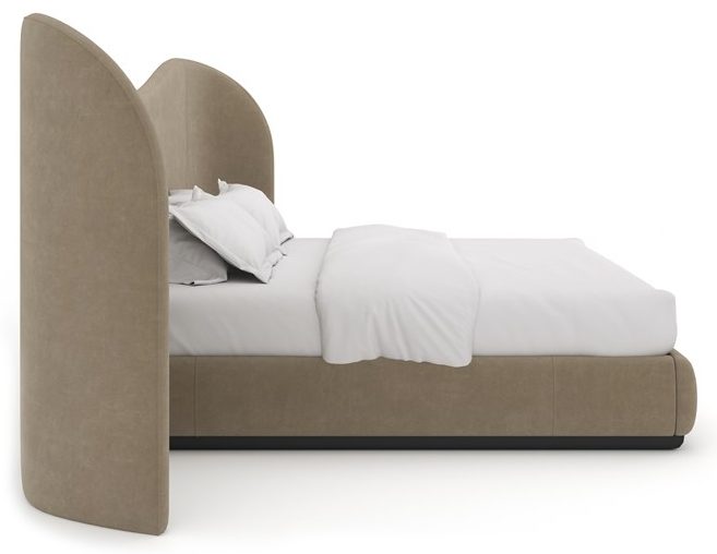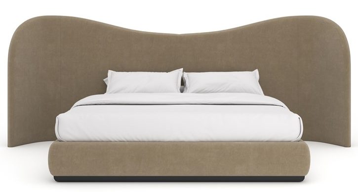 Product Description: Caracole CLA-024-103 Clio Queen Bed - Designed to be the signature piece of a bedroom, this bed will make your dreams soar. The width of the undulating headboard is more than twice the width of the bed. A hypnotic statement, the two-piece bed is fully-covered around the headboard, sideboards and footboard in ultra-soft Dark Taupe angora-like velvet. The bed sits on a plinth of Dark Chocolate.