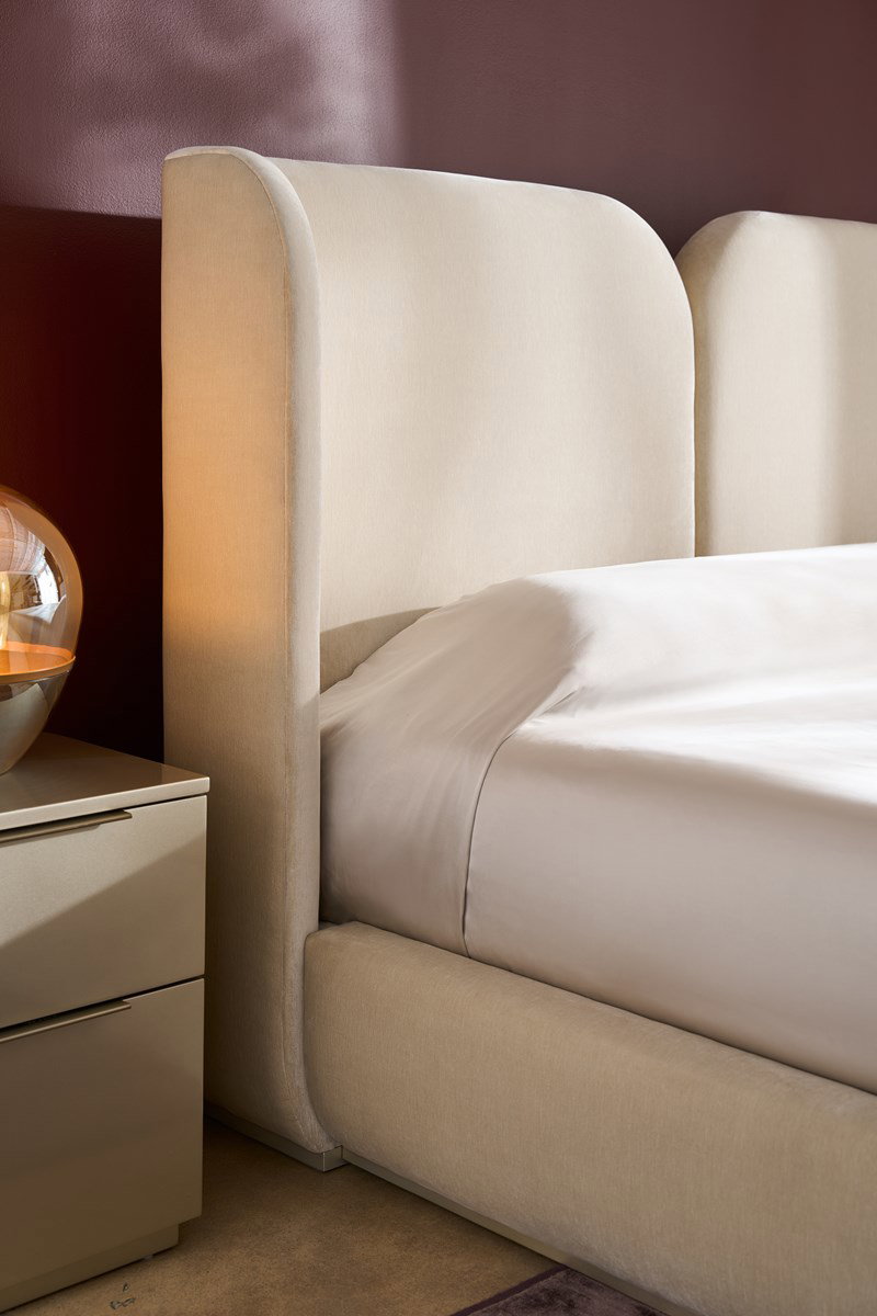 Product Description: Caracole CLA-024-105 Oblique Queen Bed - Splendid Ivory vintage velvet adorns this fully-upholstered stunner. Its distinguishing feature is the deep, dramatic cleft at the center of the headboard that gracefully extends along the flowing camelback that drapes down the back sides of the bed. The headboard, side rails and footboard are fully-upholstered. The bed rests on a thin plinth with Soft Silver Paint Gloss. This is a glorious centerpiece for a bedroom.