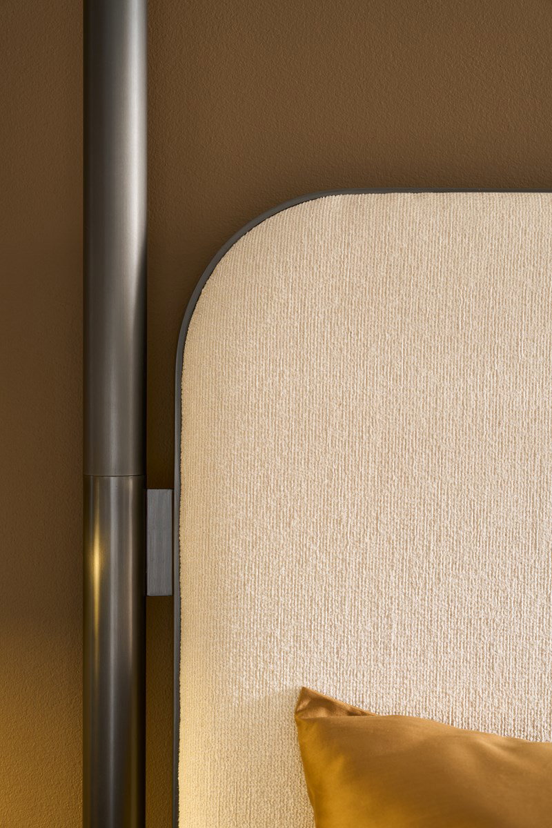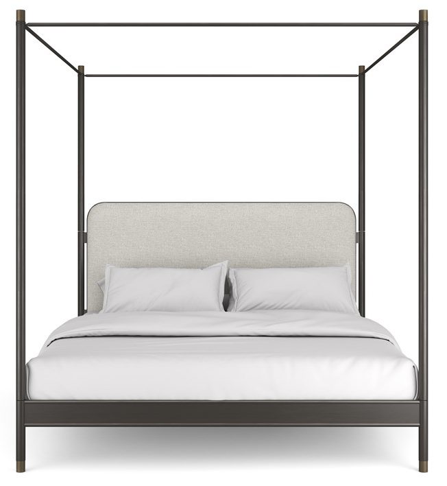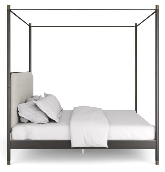 Product Description: Caracole CLA-024-126 Campaign King Bed with Canopy - Upholstered headboard, footboard and siderails. Metal frame and canopy in Brushed Deep Bronze. Headboard upholstered on backside so bed can float in the room. Headboard upholstered on backside so bed can float in the room .Headboard, footboard, side rails and canopy are packaged in one box.