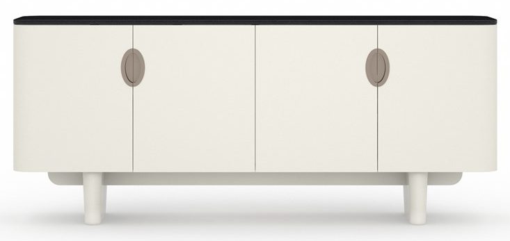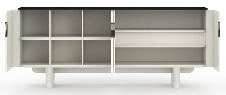 Product Description: Caracole CLA-024-252 Paragon Sideboard - A story of formality in black and white, the Paragon Sideboard is a sleek rectangular piece with generously rounded corners at each end. Its top is polished Shanxi Black Marble that is contrasted with a case finished in high-gloss Blanc. Elliptical Champagne Gold hardware is inset in the doors. On the left side of the cabinet, there is one fixed shelf with removable partitions. The right side has a drawer with a one finger pull and under-mount guides. The interior is painted to match. The piece stands on rounded trapezoidal feet in Blanc Gloss.