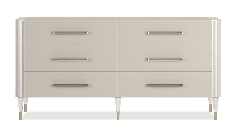 Product Description: Caracole CLA-424-014 Love It 6 Drawer Chest - The love story with this six-drawer chest begins with an inspired mix of materials. Its reeded side panels are finished in soft Matte Pearl paint. The top and fronts of the drawers are covered in pearlescent vinyl. Six drawers have elongated, jewelry-inspired Whisper of Gold pulls. Conical acrylic feet with Whisper of Gold metal ferrules enhance the feminine nature of this chest.