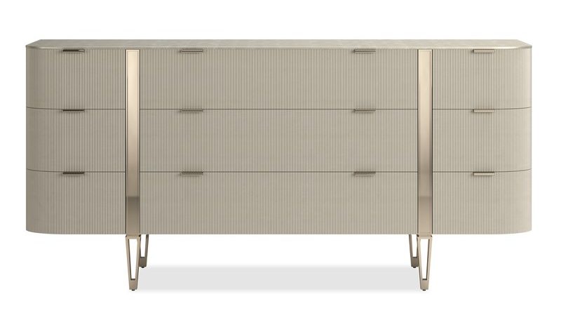 Product Description: Caracole CLA-424-031 Love At First Sight Dresser - Love At First Sight now glows in a full-covering of gleaming Oracle gold that accentuates the exquisite reeding on the drawer fronts with Whisper of Gold metal band detailing and designer legs. The piece has a gracefully rounded rectangular profile that is now dazzling in its design. The nine drawers are felt-lined with under-mount guides.
