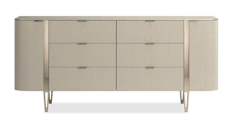 Product Description: Caracole CLA-424-034 Love At First Sight 78 Dresser - Love At First Sight has been elongated to 78 inches with two end doors with interior shelves and six center drawers. It glows in a full-covering of gleaming Oracle gold that accentuates the exquisite reeding on the drawer fronts with Whisper of Gold metal band detailing and designer legs. The piece has a gracefully rounded rectangular profile that is now dazzling in its design. The nine drawers are felt-lined with under-mount guides.