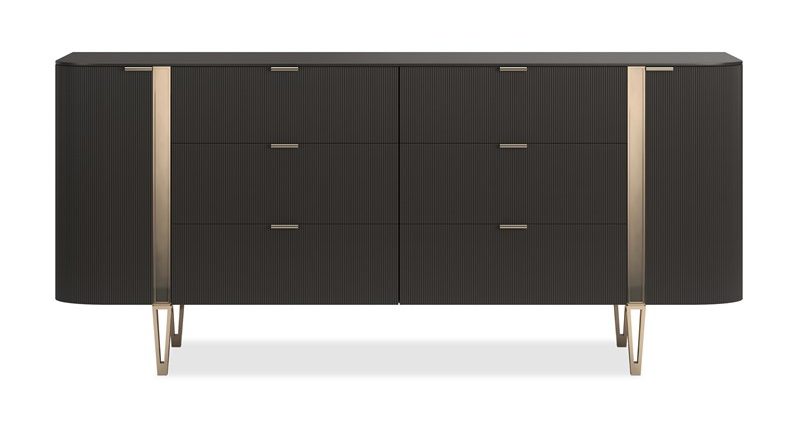 Product Description: Caracole CLA-424-035 Love At First Sight 78 Dresser - Dark and stately, Love At First Sight offers more storage at 78 inches long. It takes on a sultry demeanor in Dark Chocolate that accentuates the exquisite reeding on the drawer fronts with Whisper of Gold metal band detailing and designer legs. The piece has a gracefully rounded rectangular profile with nine drawers are felt-lined with under-mount guides.