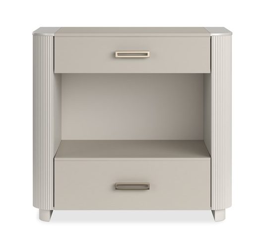 Product Description: Caracole CLA-424-0617 Love-ly! Nightstand - Reeded case finished in Matte Pearl. Top and drawer fronts covered in vinyl. Two drawers with soft close undermount drawer guides. Open storage area. Interior finish paint to match.