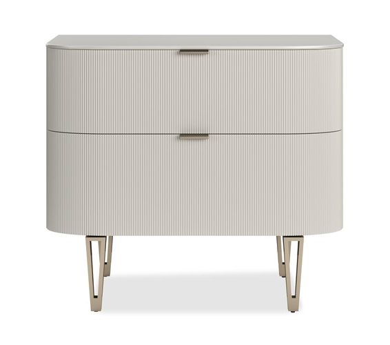 Product Description: Caracole CLA-424-0618 True Love Nightstand - Case finished in Matte Pearl. Two drawers with reeded fronts and soft close undermount guides. Metal feet in Whisper of Gold. Interior finish paint to match.
