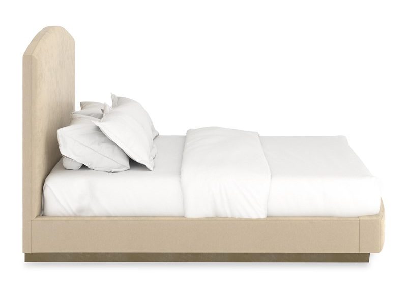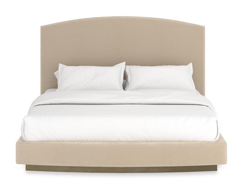 Product Description: Caracole CLA-424-101 Artois Queen Bed - Classic French forms have been contemporized in this upholstered bed with ultra-clean lines. The tall headboard is elegantly arched to mimic the curve on the front of the platform. The bed is enveloped in smooth, pumice-colored performance faux suede with a wood plinth base that glistens in Brushed Gold paint. Available in Queen and King sizes.