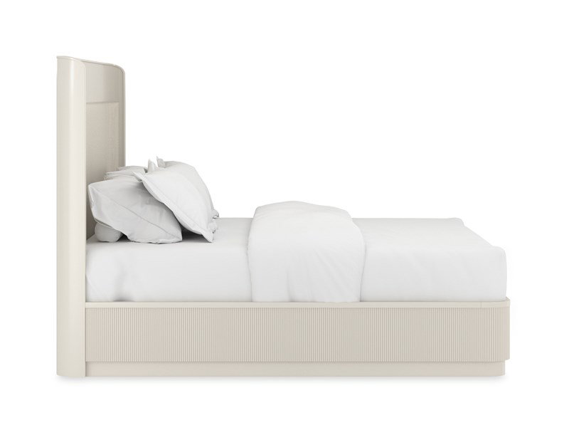 Product Description: Caracole CLA-424-109 Fall In Love Queen - Reeded upper headboard panel, footboard and side rails finished in Matte Pearl. Headboard with upholstered lower panel. Metal trim in Whisper of Gold. Plinth base.