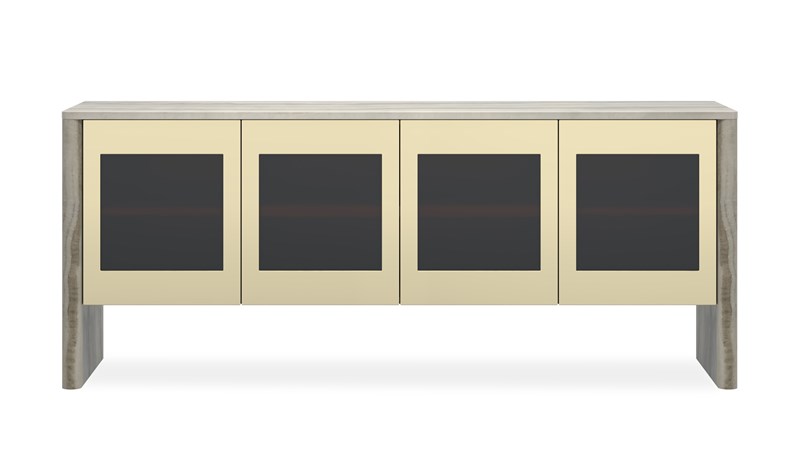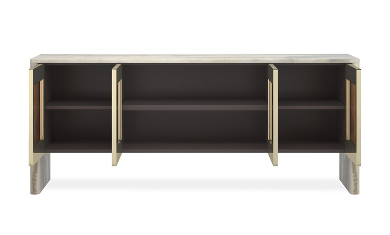 Product Description: Caracole CLA-424-214 Sojourn Sideboard - Sojourn gives off a 70s retro vibe with its “big look.” Immediately, your eyes are drawn to the large slabs of Grey onyx marble that create the legs and top of the sideboard. Inset into the stone frame are four metal doors that create Whisper of Gold frames for the inset Bronze glass front panels. Open the touch-latch doors to discover an interior finished in luxurious painted seal skin. There is an adjustable shelf behind each end door; and one adjustable shelf behind the center doors