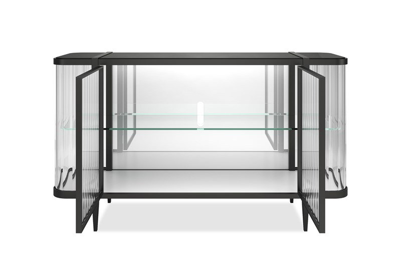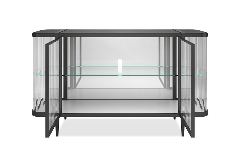 Product Description: Caracole CLA-424-215B Stop and Stare Sideboard - It’s true, this console is so extraordinary, you can’t help but Stop And Stare. It’s an instant source of brightness and reflectivity that creates a natural focal point. A wavy acrylic exterior mirrors the undulating patterns of sand and sea while its top adds another layer of organic splendor. The mirrored interior back and bottom panels are designed to reflect light as it pours in from every angle as well as mirror the beauty of the treasures you display. Glass shelves ensure unobstructed views as do its touch-latch doors with concealed hinges. A Brushed Deep Bronze outlines its rounded silhouette and four tapered feet, imparting the overall luxe feeling of a diamond in a platinum setting.