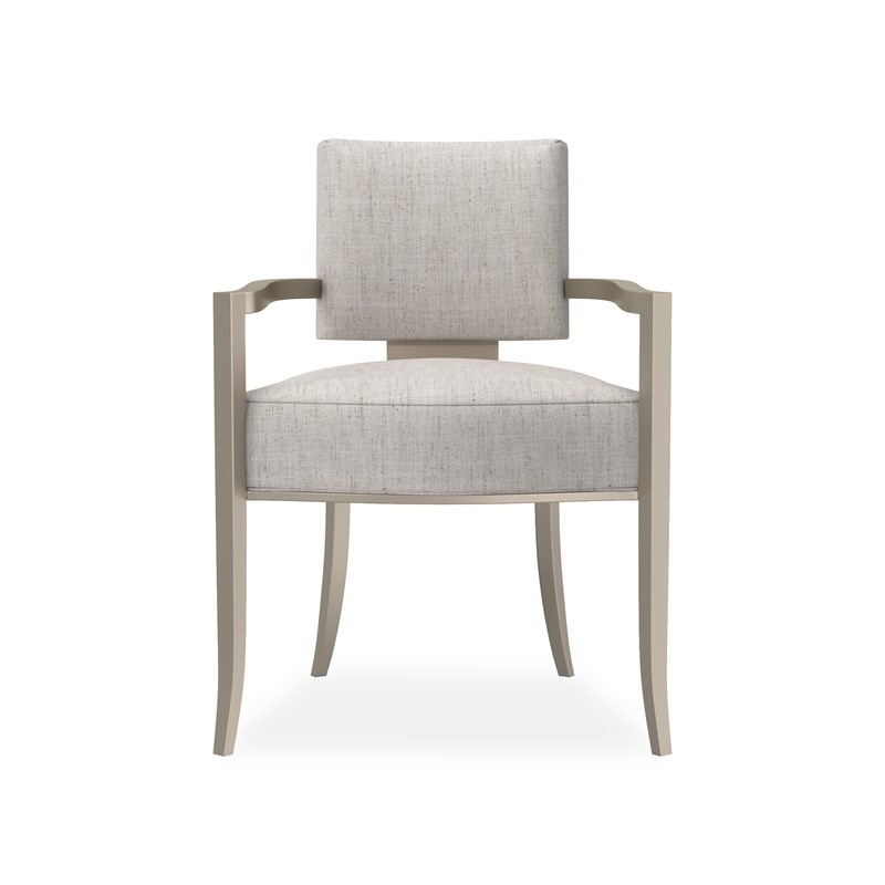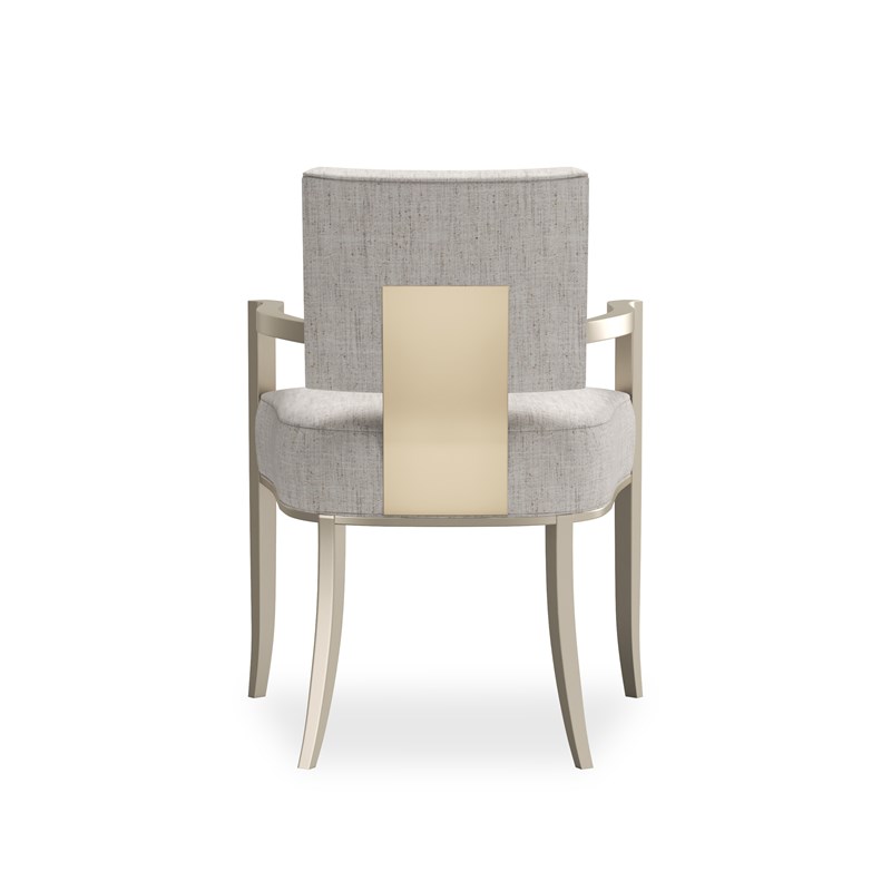 Product Description: Caracole CLA-424-275A Reserved Seating Arm Chair - This contemporary arm chair takes on dramatic style when you view the wide, Whisper of Gold panel that shines off its back. Neutral fabric fully surrounds the square upper back and seat cushion that rest on an exposed wood frame, sabre legs and gracefully curving arms finished in Soft Silver Paint. This is a low, klismos chair with truly polished appeal.