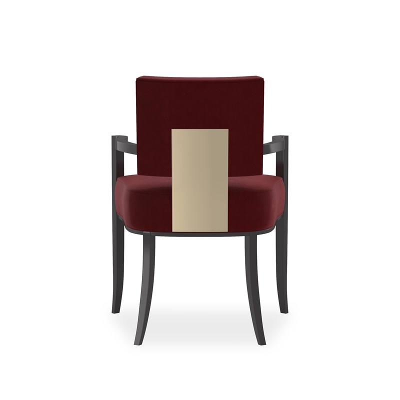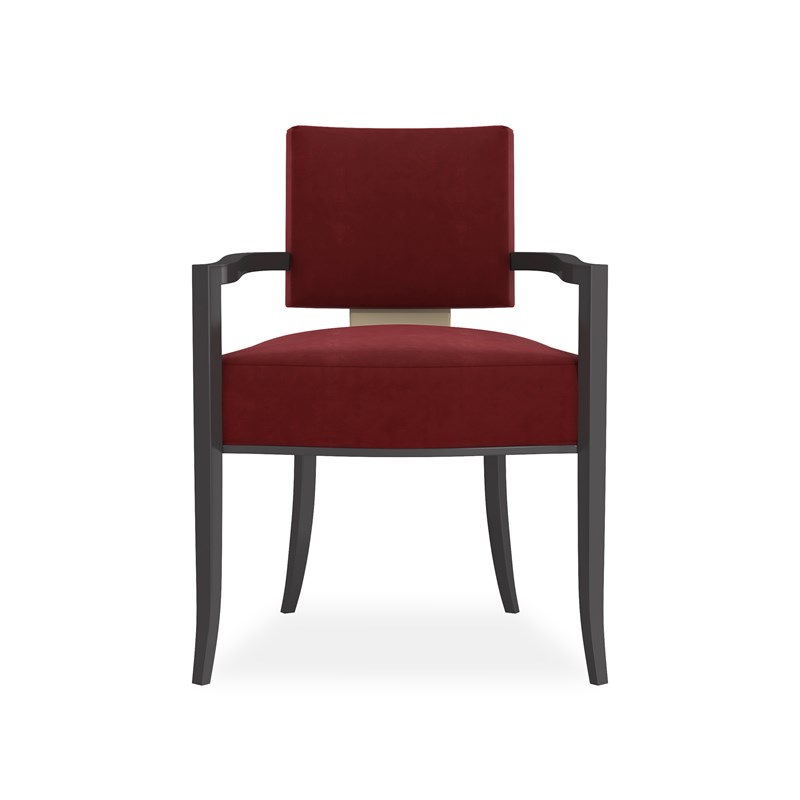 Product Description: Caracole CLA-424-275J Reserved Seating Arm Chair - This contemporary arm chair takes on dramatic style when you view the wide, Whisper of Gold panel that shines off its back. Red Velvet fabric fully surrounds the square upper back and seat cushion that rest on an exposed wood frame, sabre legs and gracefully curving arms finished in Seal Skin. This is a low, klismos chair with truly polished appeal.