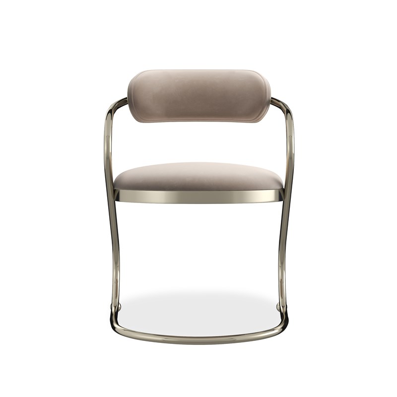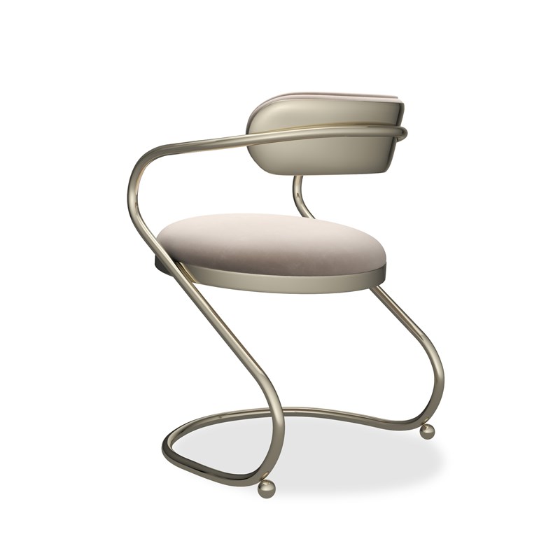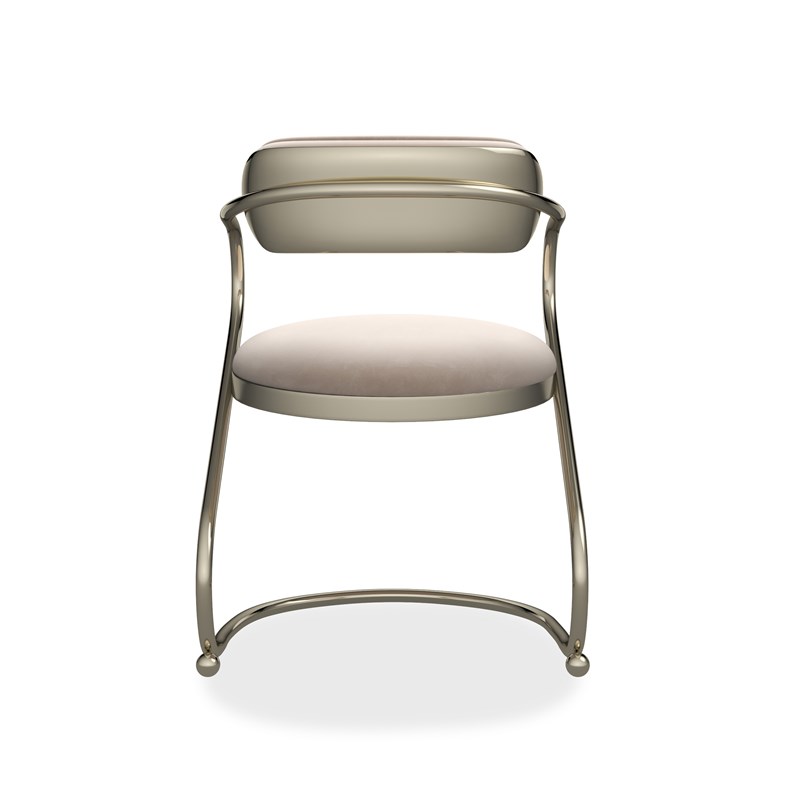 Product Description: Caracole CLA-424-293 Retrospect Chair - Art and architecture come together in Retrospect’s eye-popping continuous line of tubular metal in Whisper of Gold that supports a cantilevered seat. Contrasting with the austere use of the metal frame are the tight upholstered seat, outback and inside front in comforting light taupe velvet.