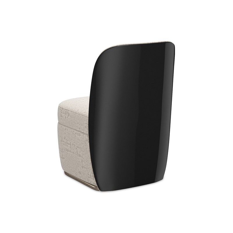 Product Description: Caracole CLA-424-294 Cabochon Chair - The Cabochon is a slipper chair that works as well when paired with a desk, as it does as a stand-alone side chair in a bedroom. Originally invented in the Victorian era, this curvaceous modern update has a high, rounded back and sits lower to the floor. The wooden oval outback is gently curved and finished in shiny Piano Black. The chair’s interior back, tight seat and rounded base are upholstered in dreamy silver-taupe distressed chenille. The thin base is Charcoal Leaf and hides the casters for easy movement.