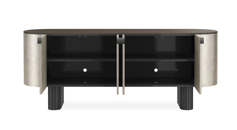 Product Description: Caracole CLA-424-531 Gustav Media Console - If you’re seeking a sleek media console with bold style, Gustav is a striking option. This elongated oval cabinet stands on slender cylindrical legs in a Deep Bronze finish. The Charcoal Leaf exterior features four doors with triangular Deep Bronze pulls that open to an Almost Black interior, complete with four adjustable shelves and wire management access. A Smoked Bronze glass top adds a refined finishing touch.