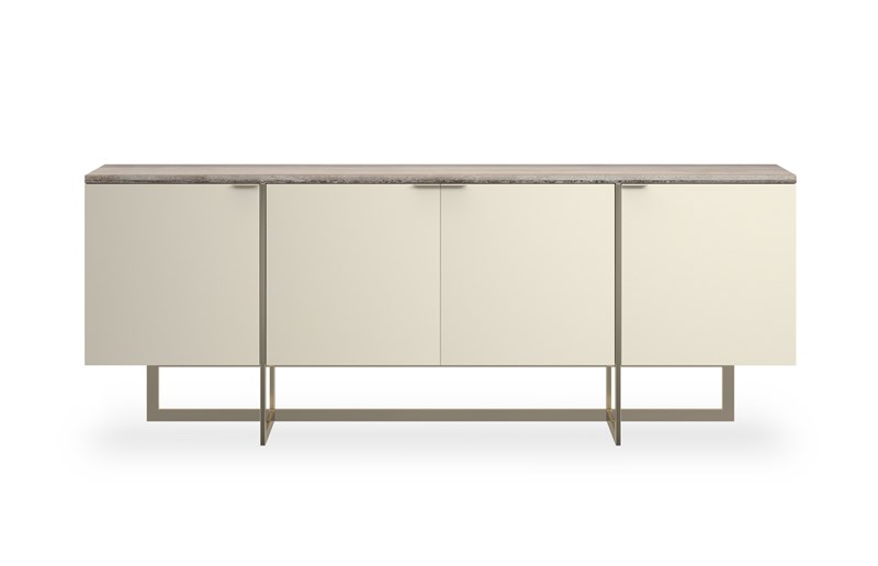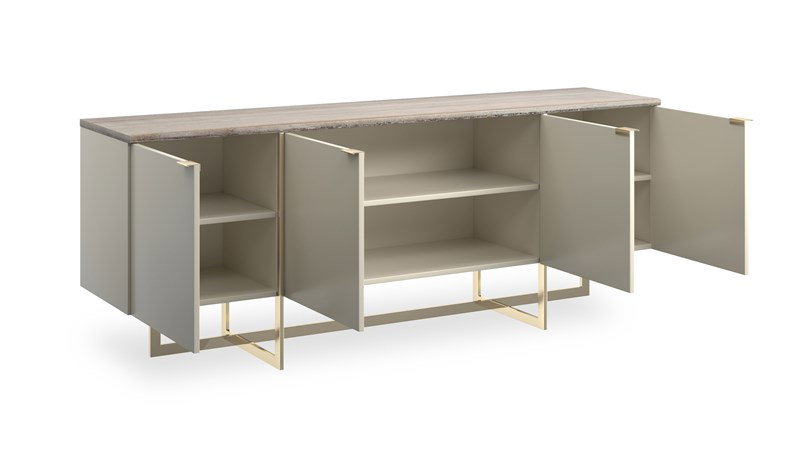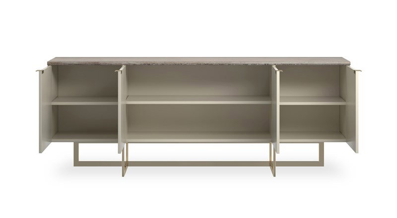 Product Description: Caracole CLA-424-533 Wish You Were Here Media - Stone, mirror-polished metal and hardwoods crisscross in this sleek media cabinet with linear appeal. Flowing Sandstone graces the 84” top of the Pearl-painted cabinet and four doors. The paint gives off just enough luster to make the piece intriguing. The doors have slim Whisper of Gold pulls. Adjustable shelving and wire access graces the inside of the cabinet. The base is the real stunner of the piece with thin intersecting bars in mirror-polished Whisper of gold that overlap each other and extend up the cabinet to add interest.