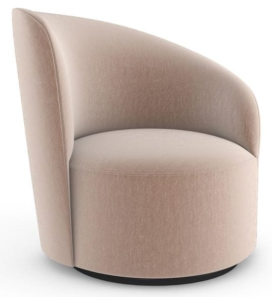 Product Description: Caracole UPH-024-038-A Whorl RAF Swivel Chair - Reminiscent of the swirls inside a seashell, this feminine piece is fully-upholstered in iridescent Taupe vintage velvet chenille. Affording a chic profile, this chair is remarkable for its asymmetrical, downward sweeping back that glides around the piece. The deep barrel seat provides posh comfort. The swivel base is finished in Almost Black. This is the perfect, soft accent piece for a bedroom, dressing room or refined living area.